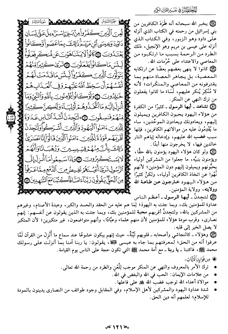 • شدة عداوة اليهود والمشركين لأهل الإسلام، وفي المقابل وجود طوائف من النصارى يدينون بالمودة للإسلام؛ لعلمهم أنه دين الحق.
