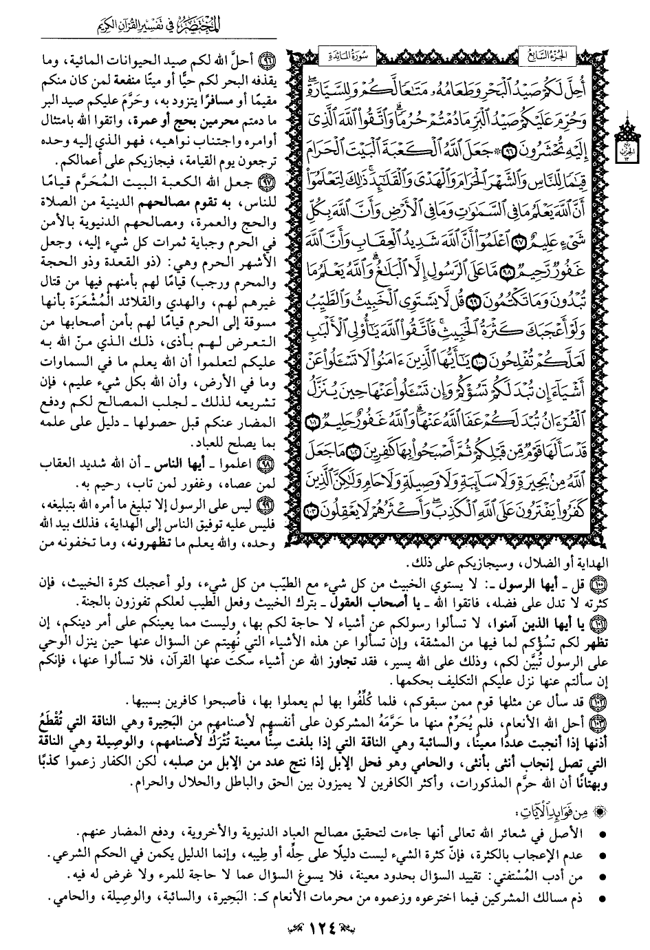 103 - أحل الله الأنعام، فلم يُحَرِّمْ منها ما حَرَّمَهُ المشركون على أنفسهم لأصنامهم من البَحِيرة وهي الناقة التي تُقْطَعُ أذنها إذا أنجبت عددا معينًا، والسائبة وهي الناقة التي إذا بلغت سِنًا معينة تتْرَكُ لأصنامهم، والوصِيلة وهي الناقة التي تصل إنجاب أنثى بأنثى، والحامي وهو فحل الإبل إذا نتج عدد من الإبل من صلبه، لكن الكفار زعموا كذبًا وبهتانًا أن الله حرَّم المذكورات، وأكثر الكافرين لا يميزون بين الحق والباطل والحلال والحرام.