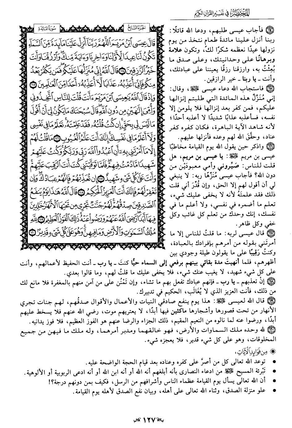 116 - واذكر حين يقول الله يوم القيامة مخاطبًا عيسى بن مريم -عليه السلام-: يا عيسى بن مريم، هل قلت للناس: صَيروني وأمي معبودَيْن من دون الله؟ فأجاب عيسى مُنَزِّهًا ربه: لا ينبغي لي أن أقول لهم إلا الحق، وإن قُدِّرَ أني قلت ذلك فقد علمتَهُ لأنه لا يخفى عليك شيء، تعلم ما أضمره في نفسي، ولا أعلم ما في نفسك، إنك وحدك من تعلم كل غائب وكل خفي وكل ظاهر.
