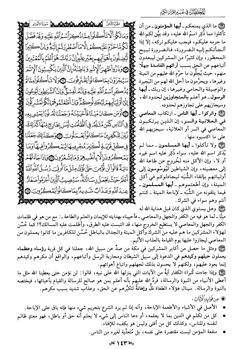 119 - ما الذي يمنعكم -أيها المؤمنون- من أن تأكلوا مما ذكِر اسمُ الله عليه، وقد بيَّن لكم الله ما حرمه عليكم، فيجب عليكم تركه، إلا إذا ألجأتكم إليه الضرورة، فالضرورة تبيح المحظور، وإن كثيرًا من المشركين ليبعدون أتباعهم عن الحق بسبب آرائهم الفاسدة جهلًا منهم، حيث يُحِلُّون ما حرَّم الله عليهم من الميتة وغيرها، ويحرِّمون ما أحل الله لهم من البَحِيرة والوَصِيلة والحامي وغيرها، إن ربك -أيها الرسول- هو أعلم بالمتجاوزبن لحدود الله، وسيجازيهم على تجاوزهم لحدوده.