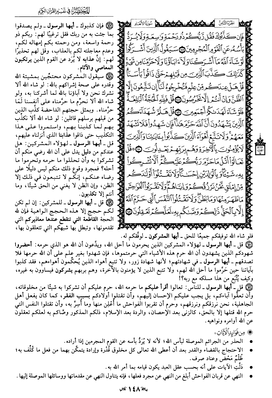 151 - قل -أيها الرسول- للناس: تعالوا أقرأ عليكم ما حرمه الله، حرم عليكم أن تشركوا به شيئًا من مخلوقاته، وأن تعقُّوا آباءكم، بل يجب عليكم الإحسان إليهم، وأن تقتلوا أولادكم بسبب الفقر، كما كان يفعل أهل الجاهلية، نحن نرزقكم ونرزقهم، وحرم أن تقربوا الفواحش ما أُعْلِن منها وما أُسِرَّ به، وأن تقتلوا النفس التي حرم الله قتلها إلا بالحق، كالزنى بعد الإحصان، والردة بعد الإسلام، ذلكم المذكور وصَّاكم به لعلكم تعقلون عن الله أوامره ونواهيه.