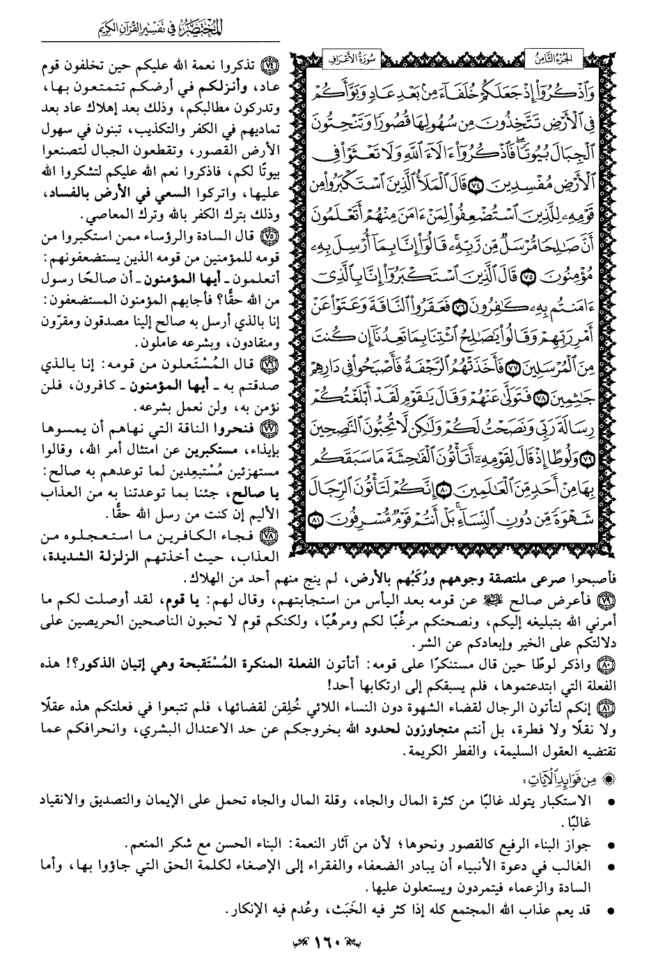 74 - تذكروا نعمة الله عليكم حين تخلفون قوم عاد، وأنزلكم في أرضكم تتمتعون بها، وتدركون مطالبكم، وذلك بعد إهلاك عاد بعد تماديهم في الكفر والتكذيب، تبنون في سهول الأرض القصور، وتقطعون الجبال لتصنعوا بيوتًا لكم، فاذكروا نعم الله عليكم لتشكروا الله عليها، واتركوا السعي في الأرض بالفساد، وذلك بترك الكفر بالله وترك المعاصي.