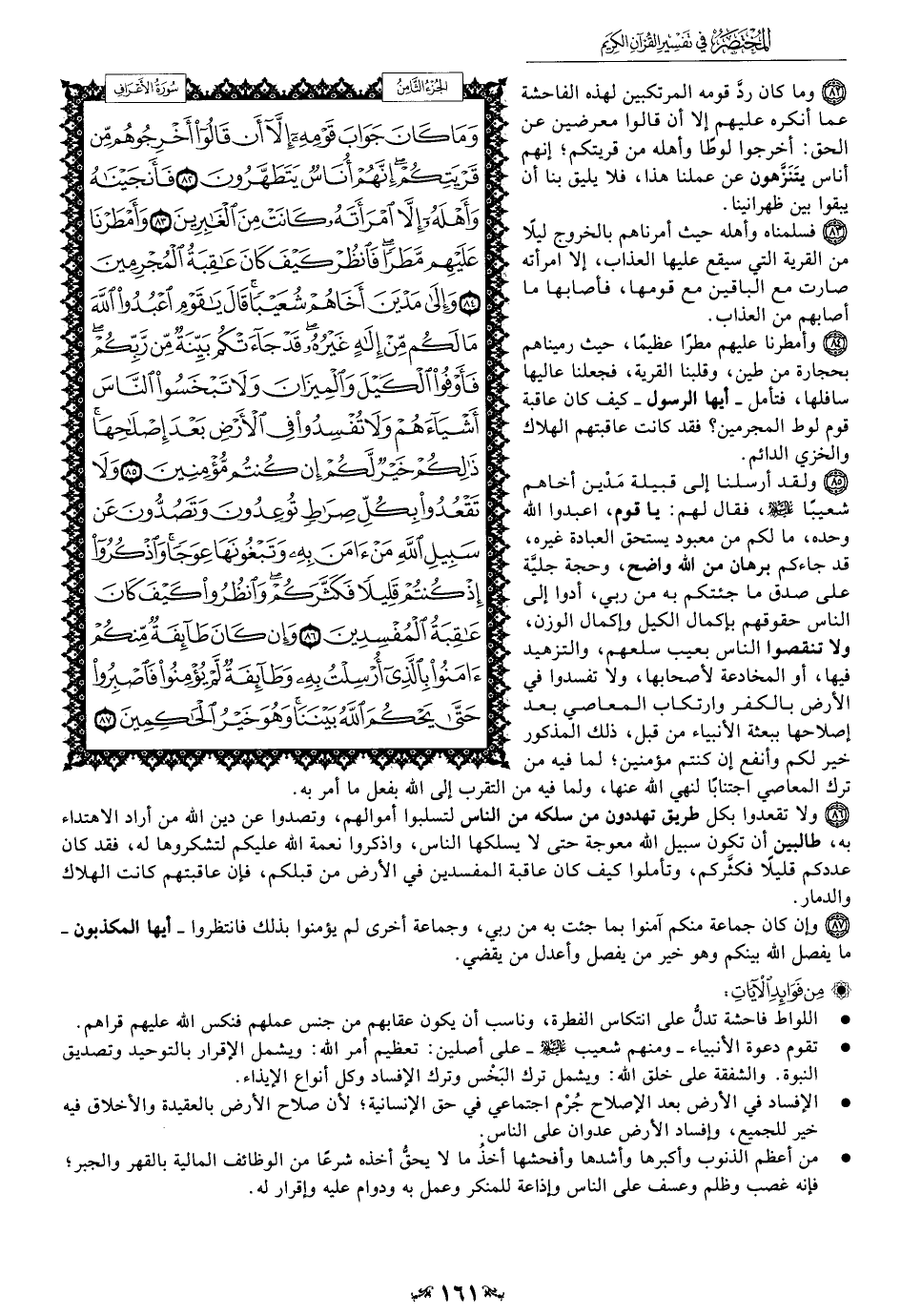 85 - ولقد أرسلنا إلى قبيلة مَدْين أخاهم شعيبًا عليه السلام، فقال لهم: يا قوم، اعبدوا الله وحده ما لكم من معبود يستحق العبادة غيره، قد جاءكم برهان من الله واضح، وحجة جليَّة على صدق ما جئتكم به من ربي، أدوا إلى الناس حقوقهم بإكمال الكيل وإكمال الوزن، ولا تنقصوا الناس بعيب سلعهم، والتزهيد فيها، أو المخادعة لأصحابها، ولا تفسدوا في الأرض بالكفر وارتكاب المعاصي بعد إصلاحها ببعثة الأنبياء من قبل، ذلك المذكور خير لكم وأنفع إن كنتم مؤمنين؛ لما فيه من ترك المعاصي اجتنابًا لنهي الله عنها، ولما فيه من التقرب إلى الله بفعل ما أمر به.