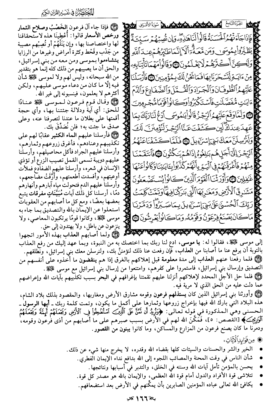 133 - فأرسلنا عليهم الماء الكثير عقابًا لهم على تكذيبهم وعنادهم، فأغرق زروعهم وثمارهم، وأرسلنا عليهم الجراد فأكل محاصيلهم، وأرسلنا عليهم دويبة تسمى القمل تصيب الزرع أو تؤذي الإنسان في شعره، وأرسلنا عليهم الضفادع فملأت أوعيتهم، وأفسدت أطعمتهم، وأرّقَتْ مضاجعهم، وأرسلنا عليهم الدم فتحولت مياه آبارهم وأنهارهم دمًا، أرسلنا كل ذلك آيات مُبَيَّنَاتٍ مفرقات يتبع بعضها بعضًا، ومع كل ما أصابهم من العقوبات استعلوا عن الإيمان بالله والتصديق بما جاء به موسى عليه السلام، وكانوا قومًا يرتكبون المعاصي، ولا ينزعون عن باطل، ولا يهتدون إلى حق.