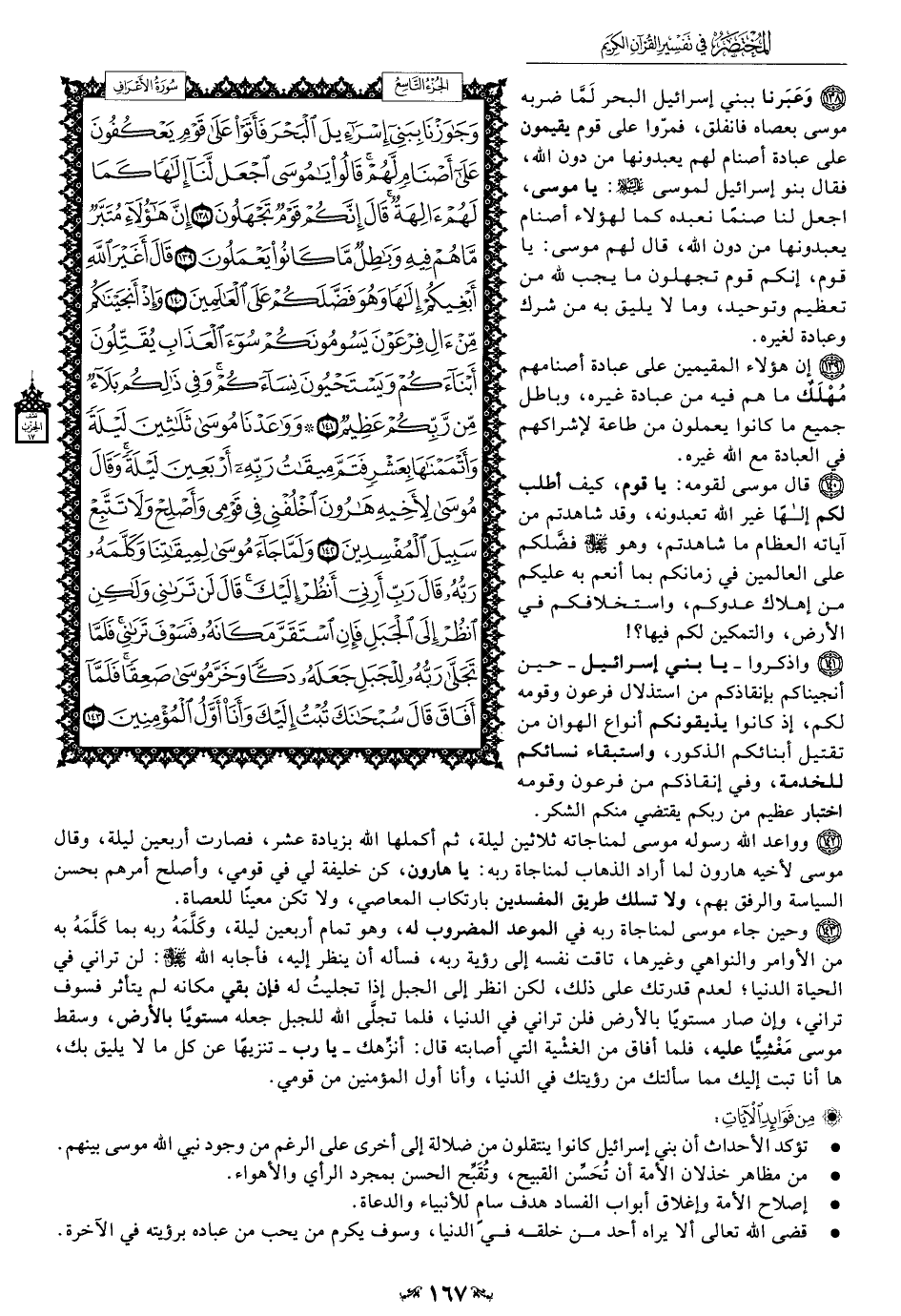 142 - وواعد الله رسوله موسى لمناجاته ثلاثين ليلة، ثم أكملها الله بزيادة عشر، فصارت أربعين ليلة، وقال موسى لأخيه هارون لما أراد الذهاب لمناجاة ربه: يا هارون، كن خليفة لي في قومي، وأصلح أمرهم بحسن السياسة والرفق بهم، ولا تسلك طريق المفسدين بارتكاب المعاصي، ولا تكن معينًا للعصاة.