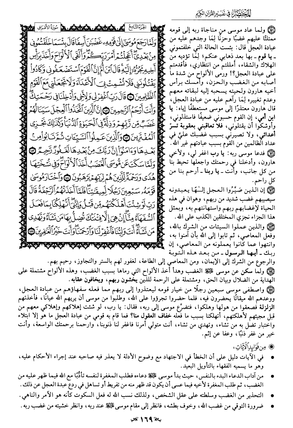 150 - ولما عاد موسى من مناجاة ربه إلى قومه ممتلئًا عليهم غضبًا وحزنا لِمَا وجدهم عليه من عبادة العجل قال: بئست الحالة التي خلفتموني -يا قوم- بها بعد ذهابي عنكم؛ لِمَا تؤديه من الهلاك والشقاء، أَمللتم من انتظاري، فأقدمتم على عبادة العجل؟! ورمى الألواح من شدة ما أصابه من الغضب والحزن، وأمسك برأس أخيه هارون ولحيته يسحبه إليه لبقائه معهم وعدم تغييره لِمَا رآهم عليه من عبادة العجل، قال هارون معتذرًا إلى موسى مستعطفًا إياه: يا ابن أمي، إن القوم حسبوني ضعيفًا فاستذلوني، وأوشكوا أن يقتلوني، فلا تعاقبني بعقوبة تسرّ أعدائي، ولا تصيرني بسبب غضبك عليَّ في عداد الظالمين من القوم بسبب عبادتهم غير الله.
