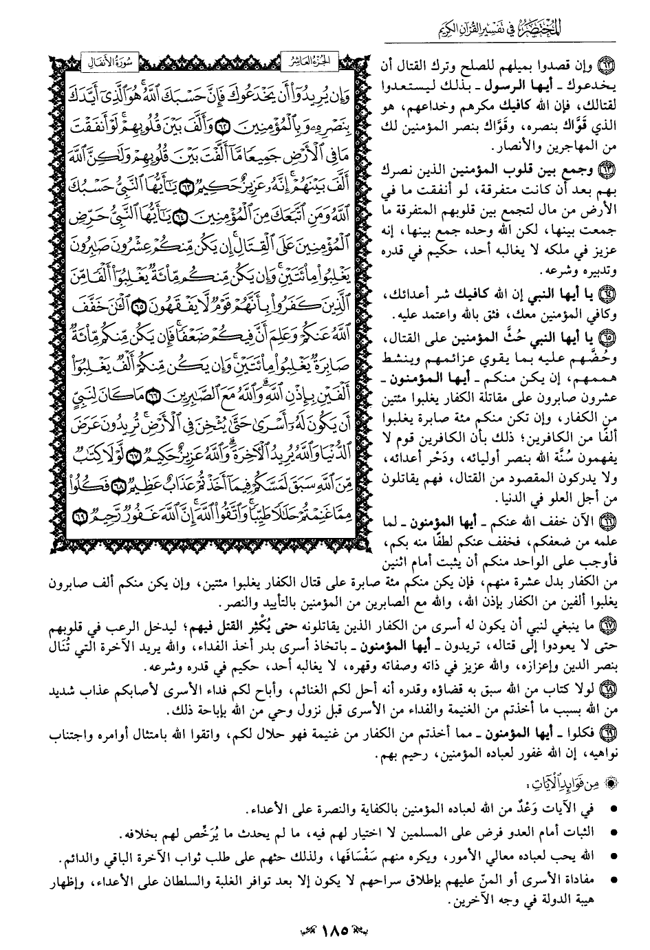65 - يا أيها النبي حُثَّ المؤمنين على القتال وحُضَّهم عليه بما يقوي عزائمهم وينشط هممهم، إن يكن منكم -أيها المؤمنون- عشرون صابرون على مقاتلة الكفار يغلبوا مئتين من الكفار، وإن تكن منكم مئة صابرة يغلبوا ألفًا من الكافرين؛ ذلك بأن الكافرين قوم لا يفهمون سُنَّة الله بنصر أوليائه، ودَحْر أعدائه، ولا يدركون المقصود من القتال، فهم يقاتلون من أجل العلو في الدنيا.