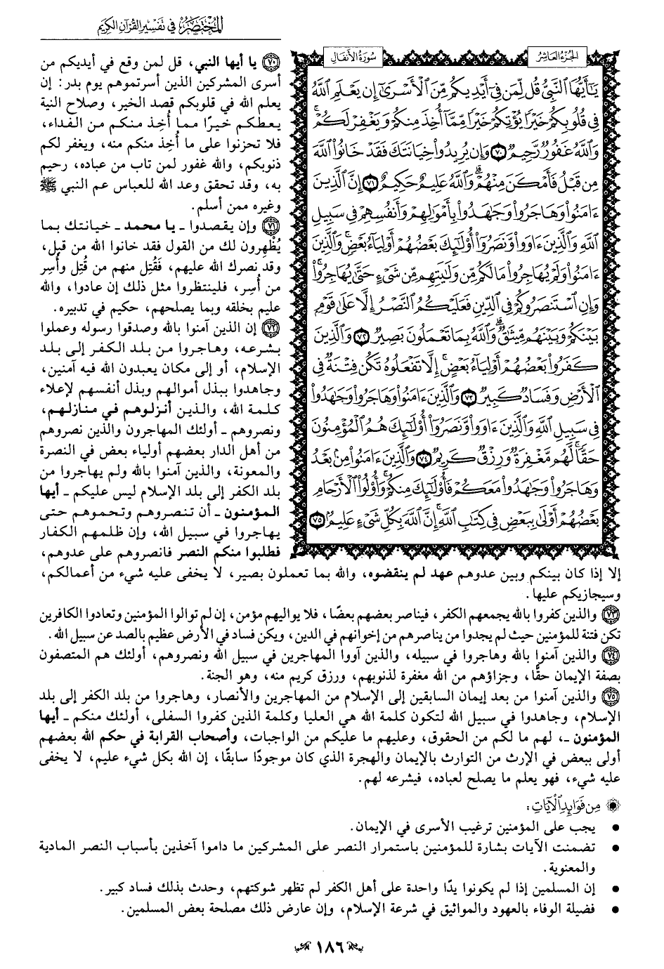 70 - يا أيها النبي، قل لمن وقع في أيديكم من أسرى المشركين الذين أسرتموهم يوم بدر: إن يعلم الله في قلوبكم بصد الخير، وصلاح النية يعطكم خيرًا مما أُخِذ منكم من الفداء فلا تحزنوا على ما أُخِذ منكم منه، ويغفر لكم ذنوبكم، والله غفور لمن تاب من عباده، رحيم به، وقد تحقق وعد الله للعباس عم النبي - صلى الله عليه وسلم - وغيره ممن أسلم.