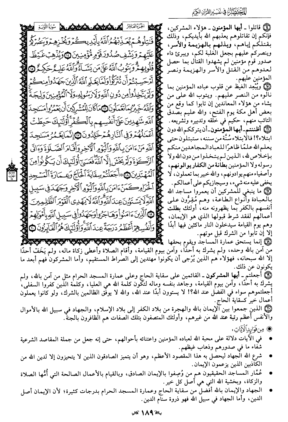 19 - أجعلتم -أيها المشركون- القائمين على سقاية الحاج وعلى عمارة المسجد الحرام مثل من آمن بالله، ولم يشرك به أحدًا، وآمن بيوم القيامة، وجاهد بنفسه وماله لتكون كلمة الله هي العليا، وكلمة الذين كفروا السفلى، أجعلتموهم سواء في الفضل عند الله؟! لا يستوون أبدًا عند الله، والله لا يوفق الظالمين بالشرك، ولو كانوا يعملون أعمال خير كسقاية الحاج.