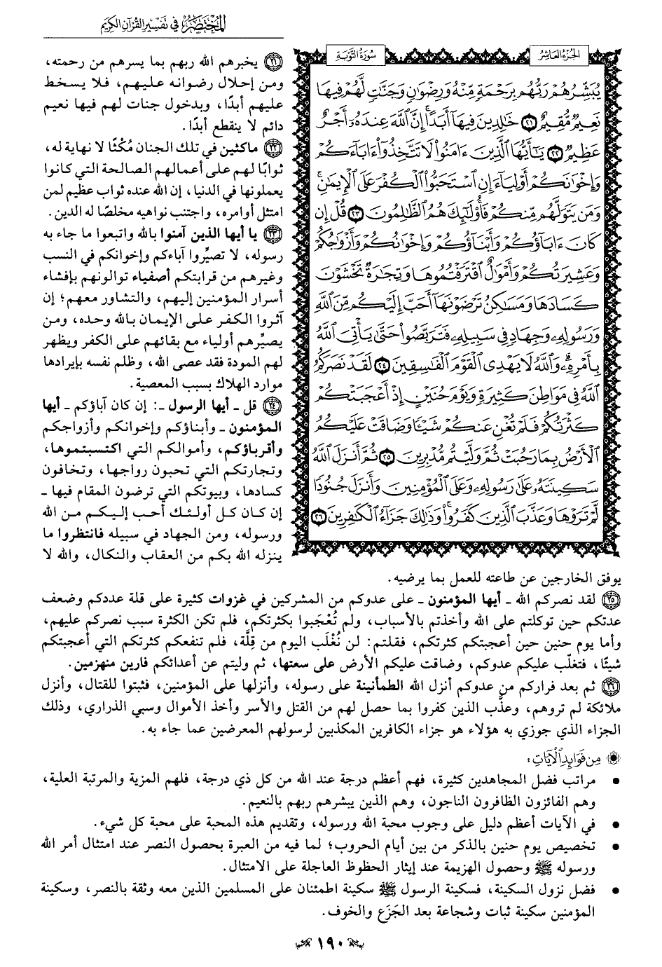 25 - لقد نصركم الله -أيها المؤمنون- على عدوكم من المشركين في غزوات كثيرة على قلة عددكم وضعف عدتكم حين توكلتم على الله وأخذتم بالأسباب، ولم تُعْجَبوا بكثرتكم، فلم تكن الكثرة سبب نصركم عليهم، وأما يوم حنين حين أعجبتكم كثرتكم، فقلتم: لن نُغْلَب اليوم من قِلَّة، فلم تنفعكم كثرتكم التي أعجبتكم شيئًا، فتغلّب عليكم عدوكم، وضاقت عليكم الأرض على سعتها، ثم وليتم عن أعدائكم فارين منهزمين.