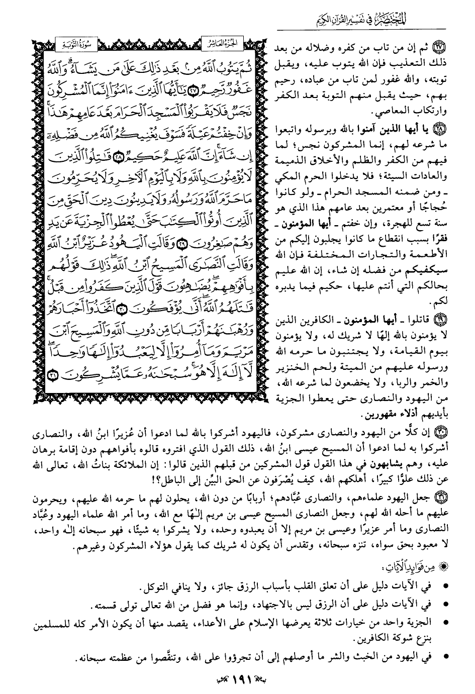 29 - قاتلوا -أيها المؤمنون- الكافرين الذين لا يؤمنون بالله إلهًا لا شريك له، يؤمنون بيوم القيامة، ولا يجتنبون ما حرمه الله ورسوله عليهم من الميتة ولحم الخنزير والخمر والربا، ولا يخضعون لما شرعه الله، من اليهود والنصارى حتى يعطوا الجزية بأيديهم أذلاء مقهورين.
