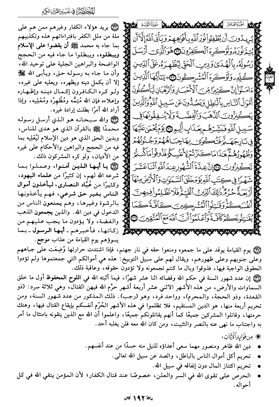 34 - يا أيها الذين آمنوا، وعملوا بما شرعه الله لهم، إن كثيرًا من علماء اليهود، وكثيرًا من عُبَّاد النصارى، ليأخذون أموال الناس بغير حق شرعي، فهم يأخذونها بالرشوة وغيرها، وهم يمنعون الناس من الدخول في دين الله. والذين يجمعون الذهب والفضة، ولا يؤدون ما يجب عليهم من زكاتها، فأخبرهم -أيها الرسول- بما يسوؤهم يوم القيامة من عذاب موجع.