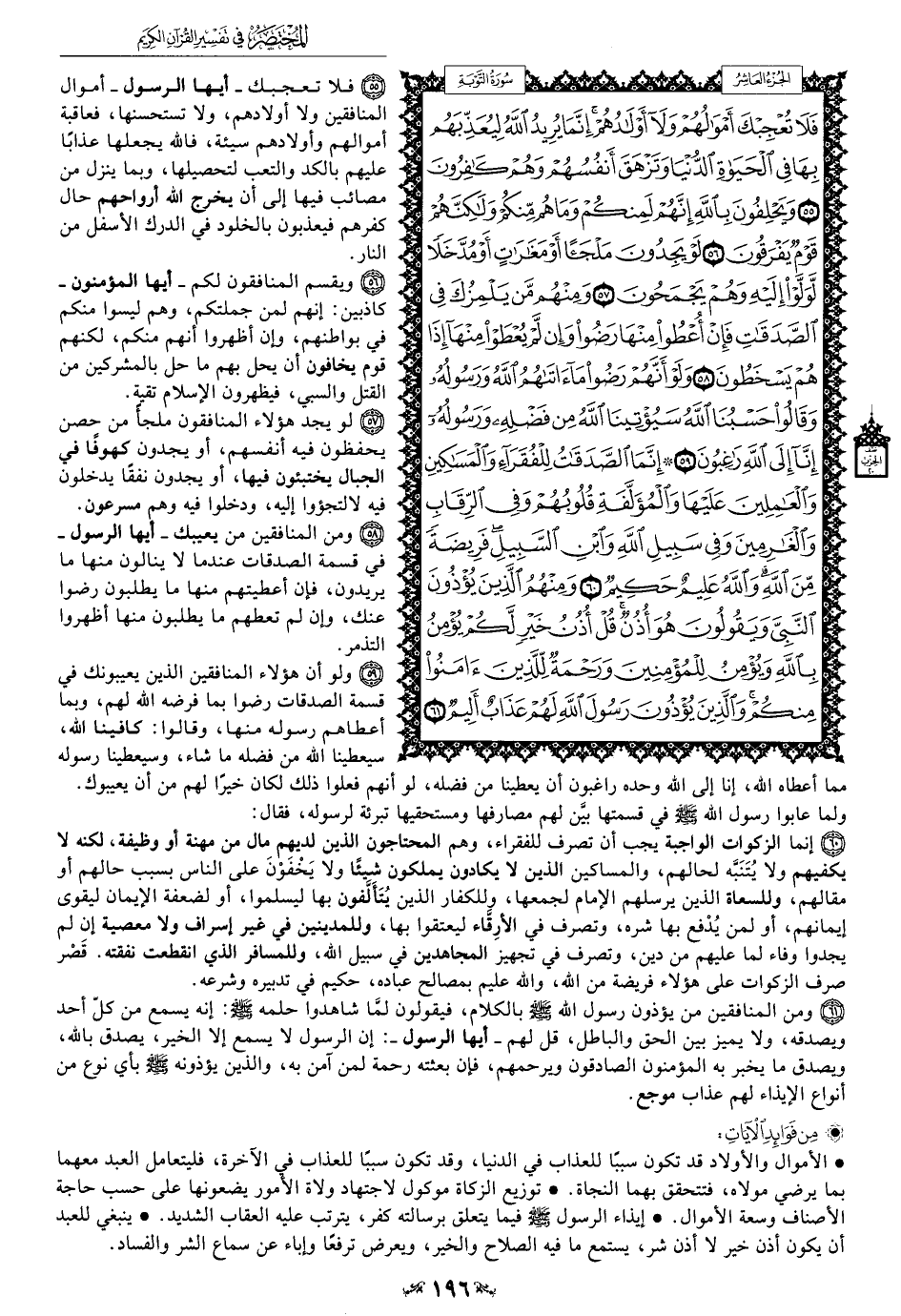 55 - فلا تعجبك -أيها الرسول- أموال المنافقين ولا أولادهم، ولا تستحسنها، فعاقبة أموالهم وأولادهم سيئة، فالله يجعلها عذابًا عليهم بالكد والتعب لتحصيلها، وبما ينزل من مصائب فيها إلى أن يخرج الله أرواحهم حال كفرهم فيعذبون بالخلود في الدرك الأسفل من النار.