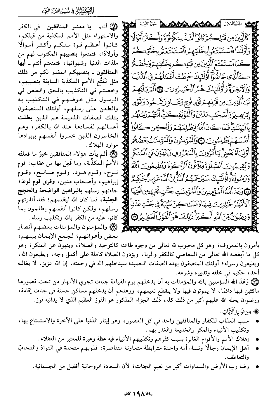 71 - والمؤمنون والمؤمنات بعضهم أنصار بعض وأعوانهم؛ لجمع الإيمان بينهم، يأمرون بالمعروف؛ وهو كل محبوب لله تعالى من وجوه طاعته كالتوحيد والصلاة، وينهون عن المنكر؛ وهو كل ما أبغضه الله تعالى من المعاصي كالكفر والربا، ويؤدون الصلاة كاملة على أكمل وجه، ويطيعون الله، ويطيعون رسوله؛ أولئك المتصفون بهذه الصفات الحميدة سيدخلهم الله في رحمته، إن الله عزيز، لا يغالبه أحد، حكيم في خلقه وتدبيره وشرعه.
