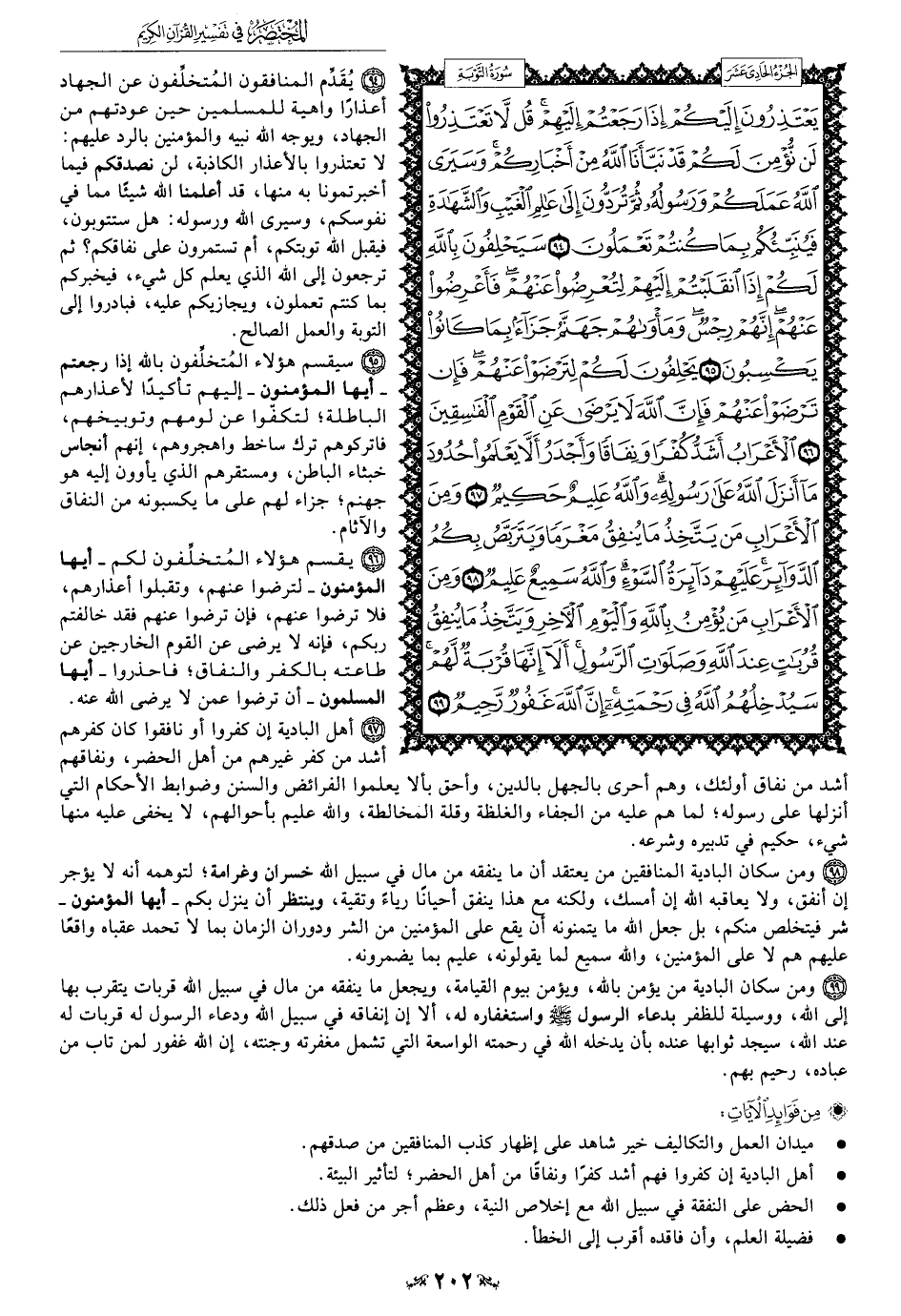 94 - يُقَدِّم المنافقون المُتخلِّفون عن الجهاد أعذارًا واهية للمسلمين حين عودتهم من الجهاد، ويوجه الله نبيه والمؤمنين بالرد عليهم: لا تعتذروا بالأعذار الكاذبة، لن نصدقكم فيما أخبرتمونا به منها، قد أعلمنا الله شيئًا مما في نفوسكم، وسيرى الله ورسوله: هل ستتوبون، فيقبل الله توبتكم، أم تستمرون على نفاقكم؟ ثم ترجعون إلى الله الَّذي يعلم كل شيء، فيخبركم بما كنتم تعملون، ويجازيكم عليه، فبادروا إلى التوبة والعمل الصالح.