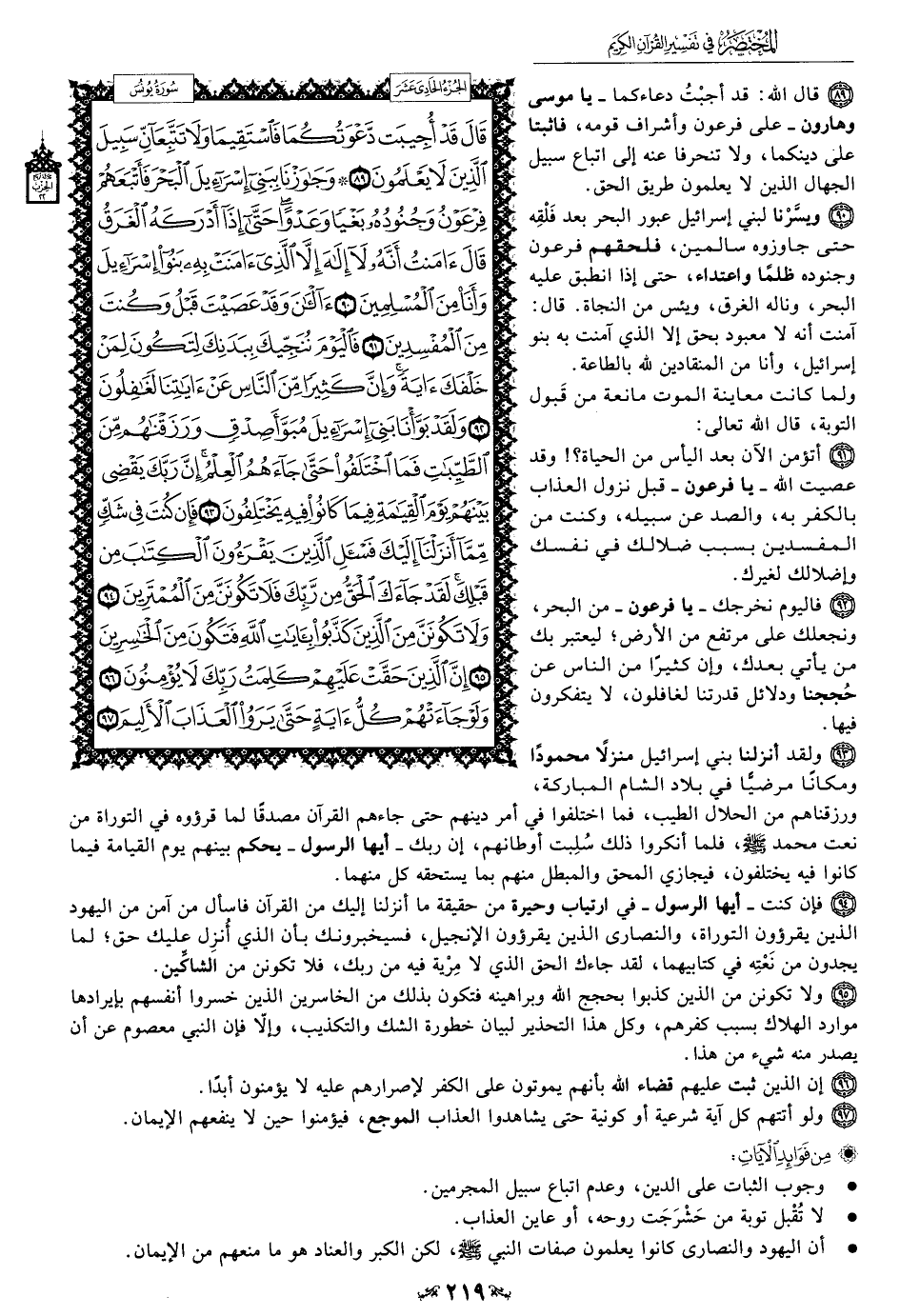 90 - ويسَّرْنا لبني إسرائيل عبور البحر بعد فَلْقِه حتَّى جاوزوه سالمين، فلحقهم فرعون وجنوده ظلمًا واعتداء، حتَّى إذا انطبق عليه البحر، وناله الغرق، ويئس من النجاة. قال: آمنت أن لا معبود بحق إلا الَّذي آمنت به بنو إسرائيل، وأنا من المنقادين لله بالطاعة.