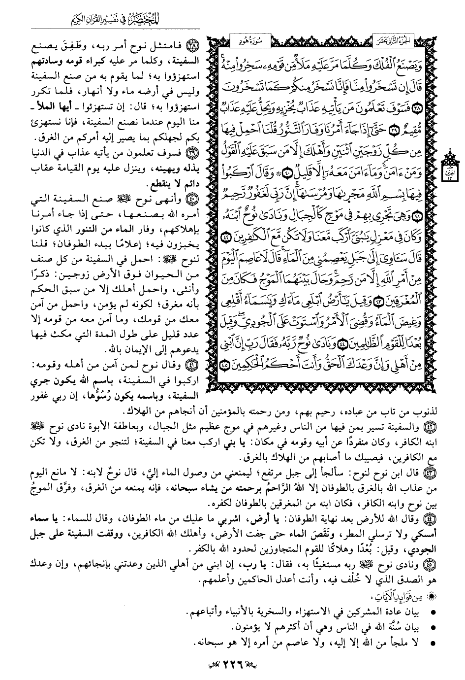 43 - قال ابن نوح لنوح: سألجأ إلى جبل مرتفع؛ ليمنعني من وصول الماء إليَّ، قال نوحٌ لابنه: لا مانع اليوم من عذاب الله بالغرق بالطوفان إلا اللهُ الرَّاحمُ برحمته من يشاء سبحانه، فإنه يمنعه من الغرف، وفرَّق الموجُ بين نوح وابنه الكافر، فكان ابنه من المغرقين بالطوفان لكفره.
