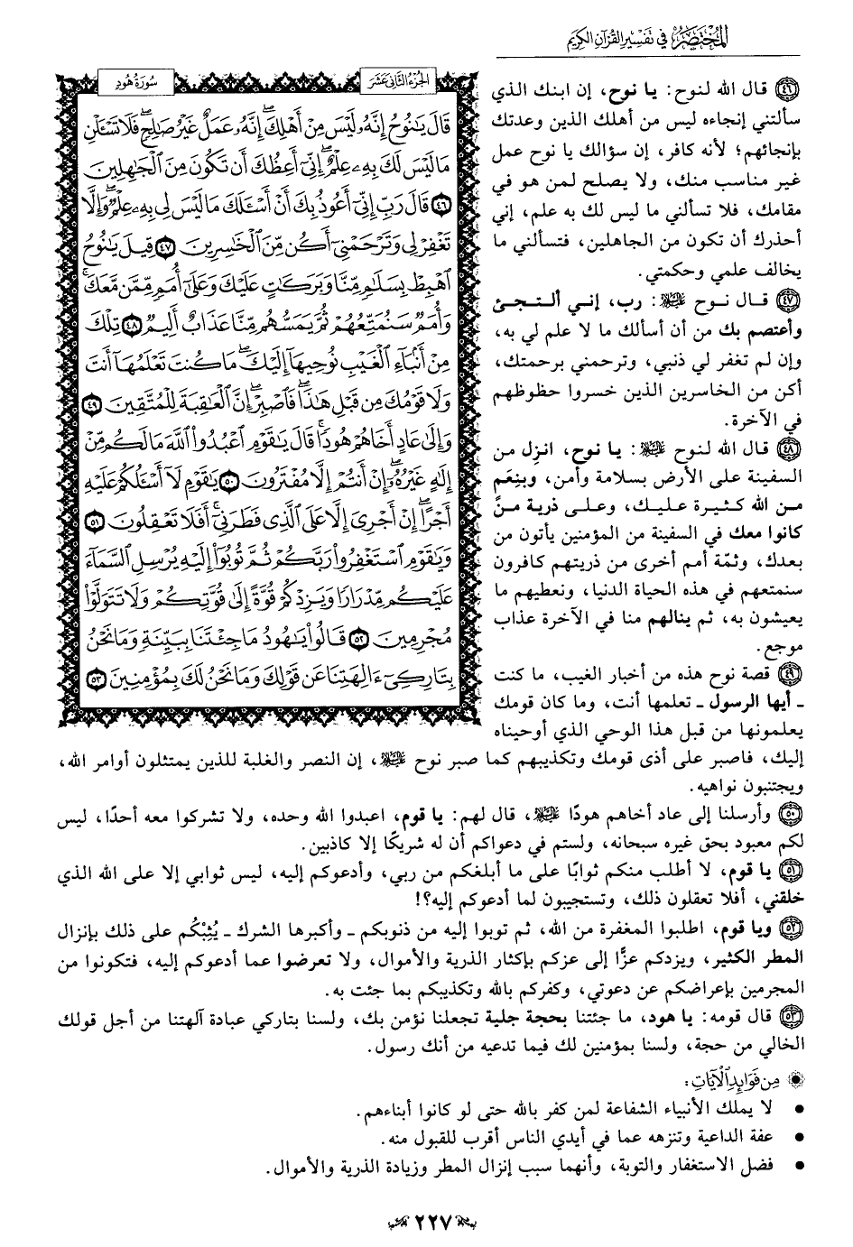 48 - قال الله لنوح عليه السلام: يا نوح، انزِل من السفينة على الأرض بسلامة وأمن، وبنِعَمٍ من الله كثيرة عليك، وعلى ذرية من كانوا معك في السفينة من المؤمنين يأتون من بعدك، وثمّة أمم أخرى من ذريتهم كافرون سنمتعهم في هذه الحياة الدنيا، ونعطيهم ما يعيشون به، ثم ينالهم منا في الآخرة عذاب موجع.
