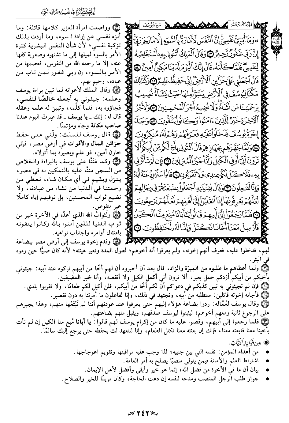 54 - قال الملك لأعوانه لما تبين براءة يوسف وعلمه: جيئوني به أجعله خالصًا لنفسي، فجاؤوه به، فلما كلَّمه، وتبين له علمه وعقله قال له: إنك -يا يوسف- قد صِرتَ اليوم عندنا صاحب مكانة وجاه ومؤتمنًا.