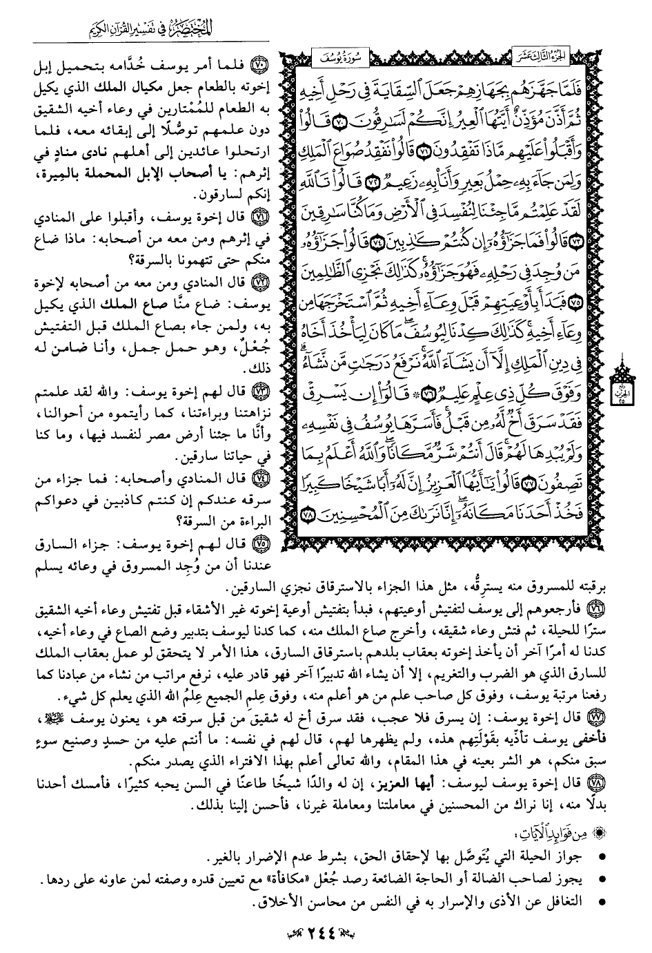 70 - فلما أمر يوسف خُدَّامه بتحميل إبل إخوته بالطعام جعل مكيال الملك الذي يكيل به الطعام للمُمْتارين في وعاء أخيه الشقيق دون علمهم توصُّلًا إلى إبقائه معه، فلما ارتحلوا عائدين إلى أهلهم نادى منادٍ في إثرهم: يا أصحاب الابل المحملة بالمِيرة، إنكم لسارقون.