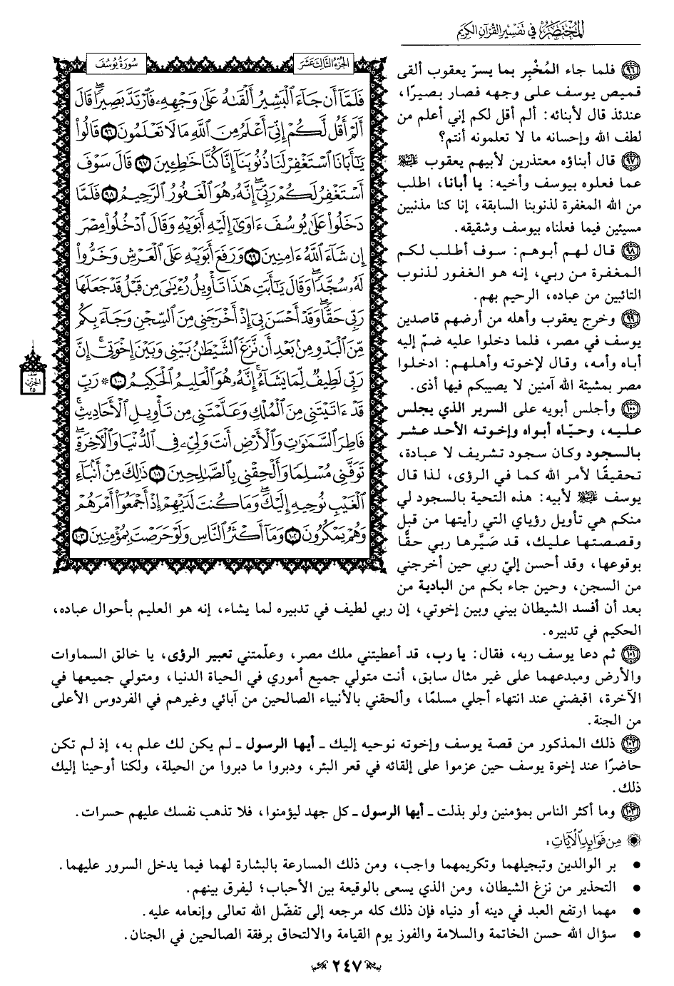101 - ثم دعا يوسف ربه، فقال: يا رب، قد أعطيتني ملك مصر، وعلّمتني تعبير الرؤى، يا خالق السماوات والأرض ومبدعهما على غير مثال سابق، أنت متولي جميع أموري في الحياة الدنيا، ومتولي جميعها في الآخرة، اقبضني عند انتهاء أجلي مسلمًا، وألحقني بالأنبياء الصالحين من آبائي وغيرهم في الفروس الأعلى من الجنة.
