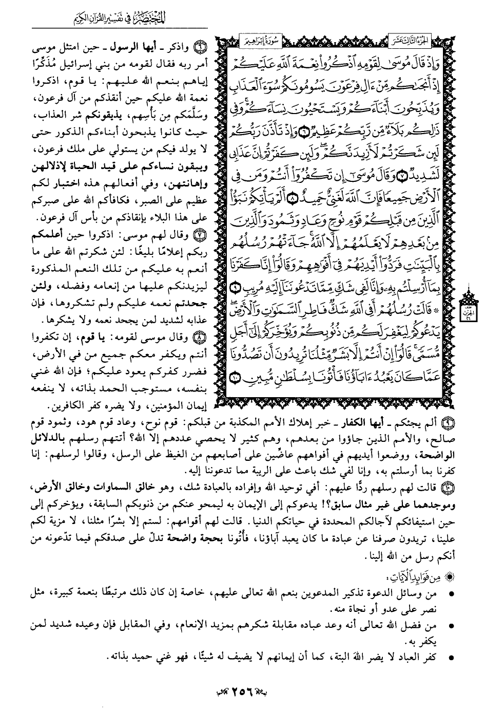 9 - واذكر -أيها الرسول- حين امتثل موسى أمر ربه فقال لقومه من بني إسرائيل مُذكِّرًا إياهم بنعم الله عليهم: يا قوم، اذكروا نعمة الله عليكم حين أنقذكم من آل فرعون، وسَلَّمَكم مِن بَأْسِهم، يذيقونكم شر العذاب، حيث كانوا يذبحون أبناءكم الذكور حتى لا يولد فيكم من يستولي على ملك فرعون، ويبقون نساءكم على قيد الحياة لإذلالهن وإهانتهن، وفي أفعالهم هذه اختبار لكم عظيم على الصبر، فكافأكم الله على صبركم على هذا البلاء بإنقاذكم من بأس آل فرعون.