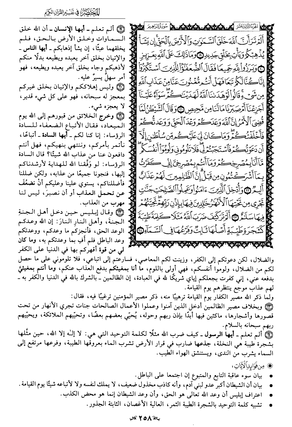 24 - ألم تعلم -أيها الرسول- كيف ضرب الله مثلًا لكلمة التوحيد التي هي: لا إله إلا الله، حين مثَّلها بشجرة طيبة هي النخلة، جذعها ضارب في قرار الأرض تشرب الماء بعروقها الطيبة، وفرعها مرتفع إلى السماء يشرب من الندى، ويستنشق الهواء الطيب.
