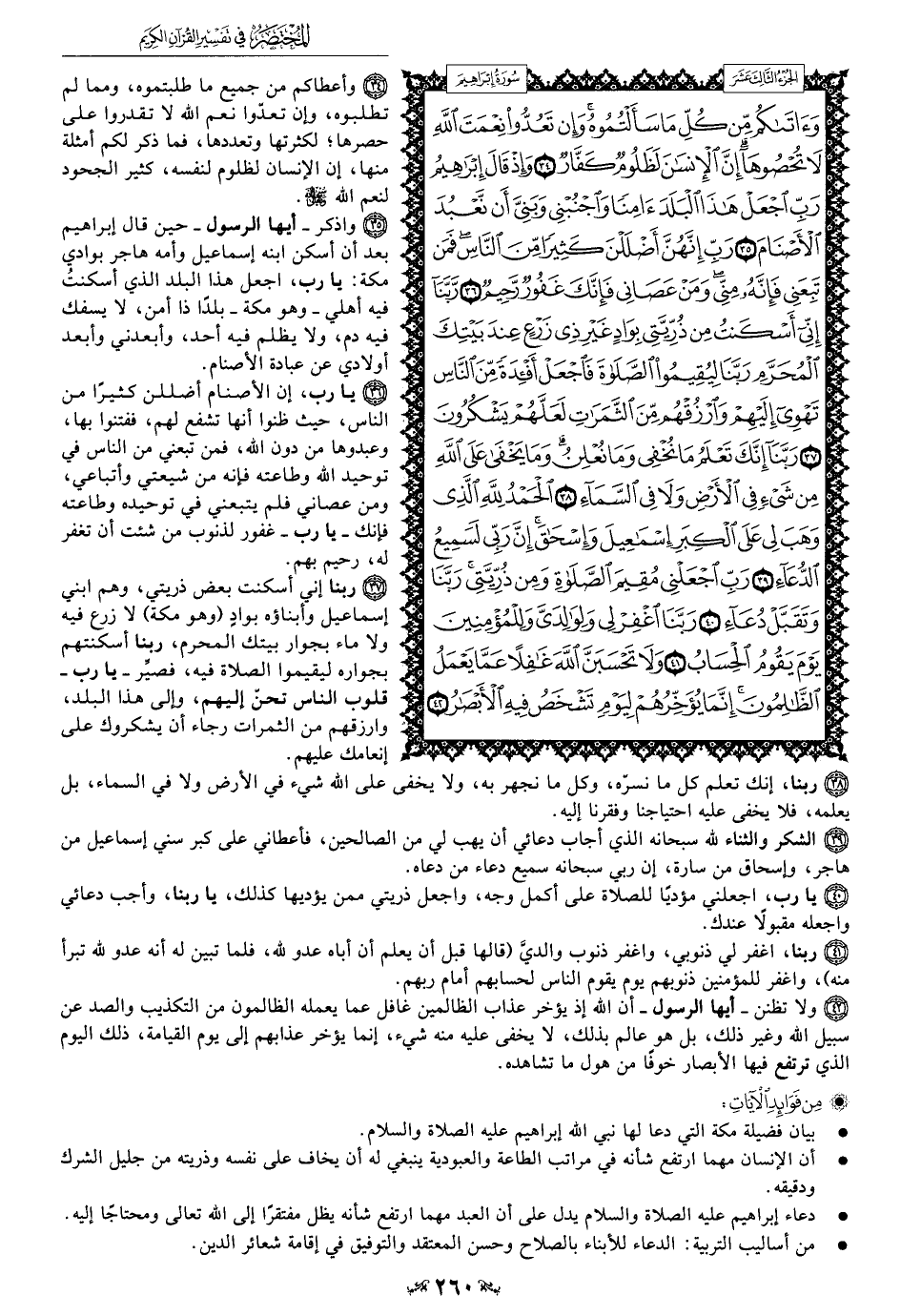 37 - ربنا إني أسكنت بعض ذريتي، وهم ابني إسماعيل وأبناؤه بوادٍ (وهو مكة) لا زرع فيه ولا ماء بجوار بيتك المحرم، ربنا أسكنتهم بجواره ليقيموا الصلاة فيه، فصيَّر - يا رب - قلوب الناس تحنّ إليهم، وإلى هذا البلد، وارزقهم من الثمرات رجاء أن يشكروك على إنعامك عليهم.