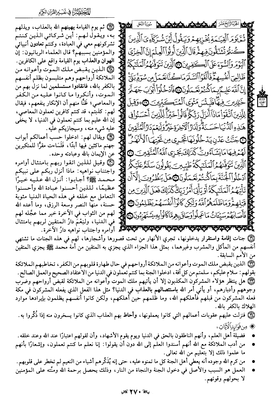 32 - الذين يقبض ملك الموت وأعوانه من الملائكة أرواحهم في حال طهارة قلوبهم من الكفر، تخاطبهم الملائكة بقولهم: سلام عليكم، سلمتم من كل آفة، ادخلوا الجنة بما كنتم تعملون في الدنيا من الاعتقاد الصحيح والعمل الصالح.