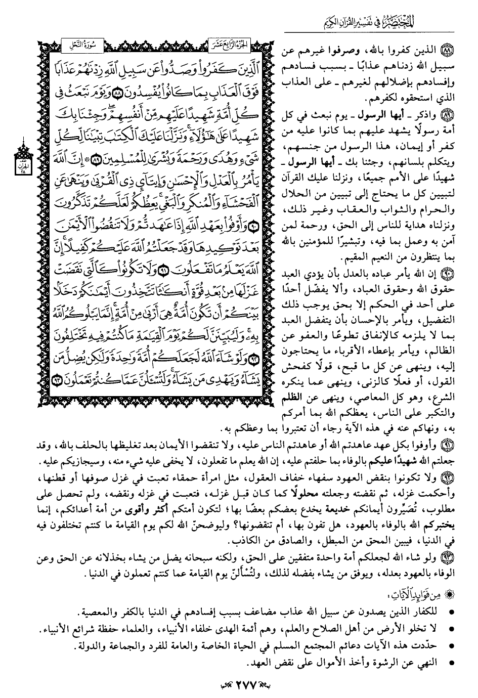 89 - واذكر -أيها الرسول- يوم نبعث في كل أمة رسولًا يشهد عليهم بما كانوا عليه من ويتكلم بلسانهم، وجئنا لك -أيها الرسول- شهيدًا على الأمم جميعًا، ونزلنا عليك القران لتبيين كل ما يحتاج إلى تبيين من الحلال والحرام والثواب والعقاب وغير ذلك، ونزلناه هداية للناس إلى الحق، ورحمة لمن آمن به وعمل بما فيه، وتبشيرًا للمؤمنين بالله بما ينتظرون من النعيم المقيم.