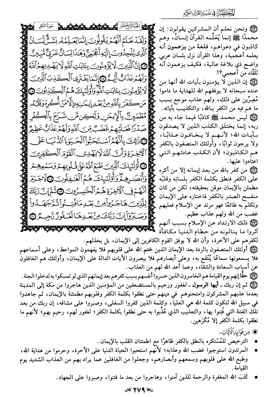 106 - من كفر بالله من بعد إيمانه إلا من أكره على الكفر فنطق بكلمة الكفر بلسانِهِ وقلبُه مطمئن بالإيمان موقن بحقيقته، لكن من كان منفسح الصدر بالكفر فاختاره على الإيمان وتكلم به طائعًا فهو مرتد عن الإسلام فعليهم غضب من الله ولهم عذاب عظيم.