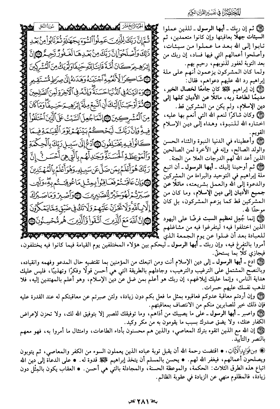 125 - ادع -أيها الرسول- إلى دين الإسلام أنت ومن اتبعك من المؤمنين بما تقتضيه حال المدعو وانقياده، وبالنصح المشتمل على الترغيب والترهيب، وجادلهم بالطريقة التي هي أحسن قولًا وفكرًا وتهذيبًا، فليس عليك هداية الناس، وإنما عليك إبلاغهم، إن ربك هو أعلم بمن ضل عن دين الإسلام، وهو أعلم بالمهتدين إليه، فلا تذهب نفسك عليهم حسرات.