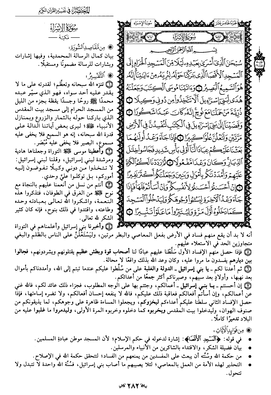 y 1 - تنزه الله سبحانه وتعظَّم؛ لقدرته على ما لا يقدر عليه أحد سواه، فهو الذي سيّر عبده محمدًا - صلى الله عليه وسلم - روحًا وجسدًا يقظة بجزء من الليل من المسجد الحرام إلى مسجد بيت المقدس الذي باركنا حوله بالثمار والزروع وبمنازل الأنبياء عليهم السلام؛ ليرى بعض آياتنا الدالة على قدرة الله سبحانه، إنه هو السميع فلا يخفى عليه مسموع، البصير فلا يخفى عليه مُبْصَر.
