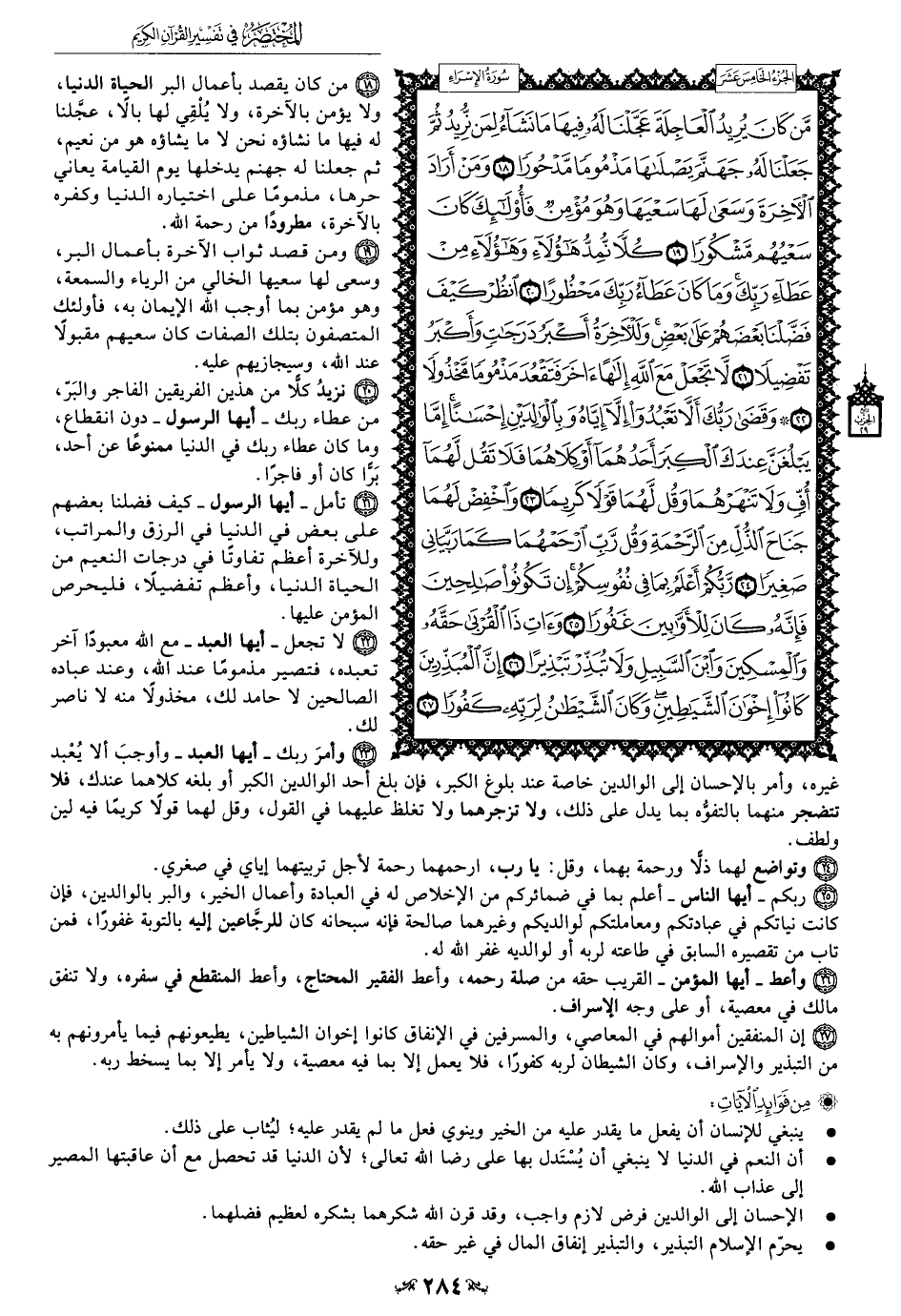 26 - وأعط - أيها المؤمن - القريب حقه من صلة رحمه، وأعط الفقير المحتاج، وأعط المنقطع في سفره، ولا تنفق مالك في معصية، أو على وجه الاسراف.