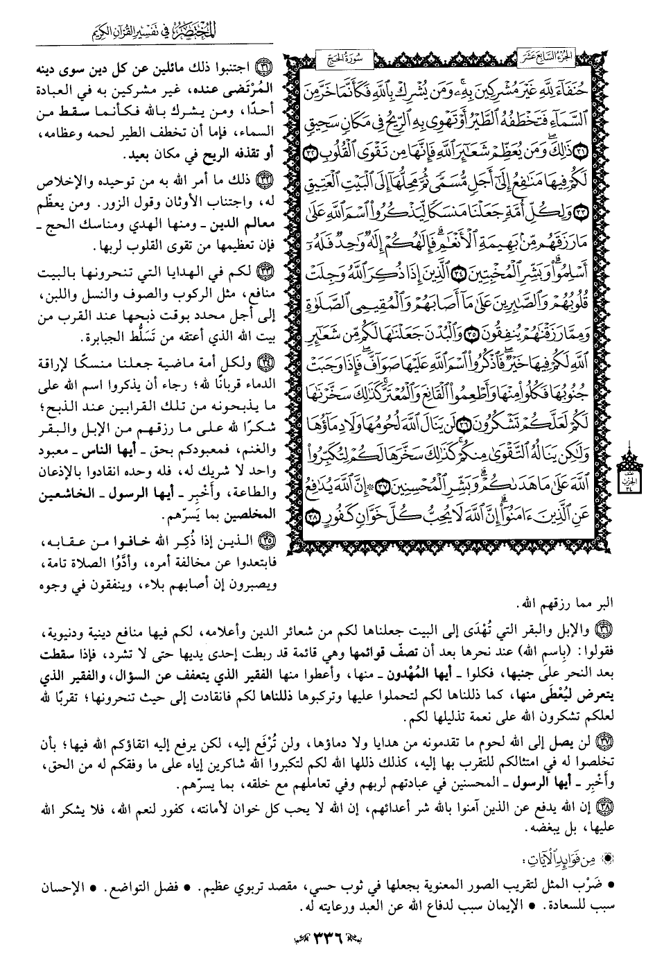 34 - ولكل أمة ماضية جعلنا منسكًا لإراقة الدماء قربانًا لله؛ رجاء أن يذكروا اسم الله على ما يذبحونه من تلك القرابين عند الذبح؛ شكرًا لله على ما رزقهم من الإبل والبقر والغنم, فمعبودكم بحق -أيها الناس- معبود واحد لا شريك له, فله وحده انقادوا بلإذعان والطاعة, أخبر -أيها الرسول- الخاشعين المخلصين بما يَسرّهم.