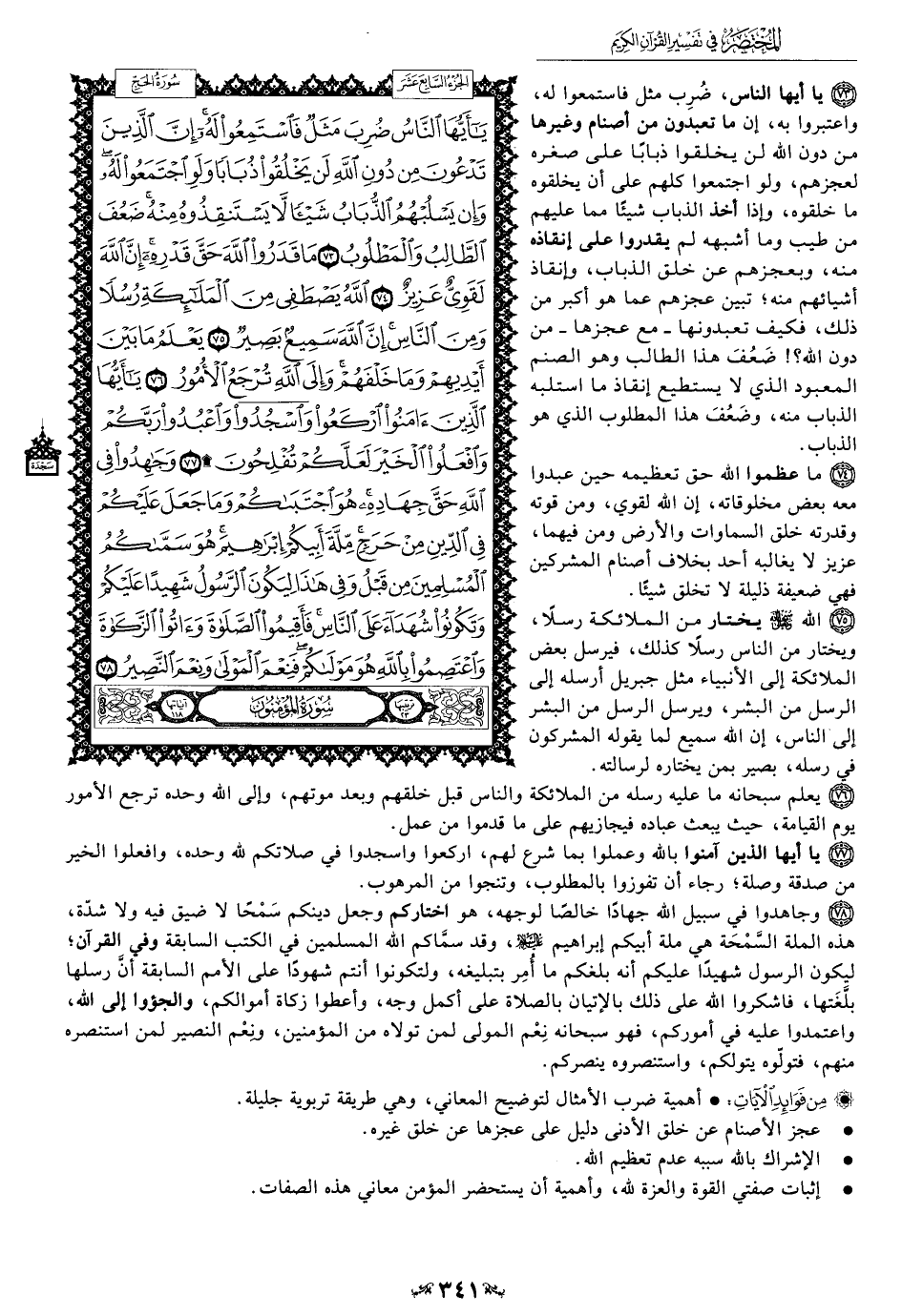 78 - وجاهدوا في سبيل الله جهادًا خالصًا لوجهه، هو اختاركم وجعل دينكم سَمْحًا لا ضيق فيه ولا شدّة، هذه الملة السمْحَة هي ملة أبيكم إبراهيم عليه السلام، وقد سماكم الله المسلمين في الكتب السابقة وفي القرآن؛ ليكون الرسول شهيدًا عليكم أنه بلغكم ما أمِر بتبليغه، ولتكونوا أنتم شهودًا على الأمم السابقة أنّ رسلها بلَّغَتها، فاشكروا الله على ذلك بالإتيان بالصلاة على أكمل وجه، وأعطوا زكاة أموالكم، والجؤوا إلى الله، واعتمدوا عليه في أموركم، فهو سبحانه نِعْم المولى لمن تولاه من المؤمنين، ونعْم النصير لمن استنصره منهم، فتولوه يتولكم، واستنصروه ينصركم.