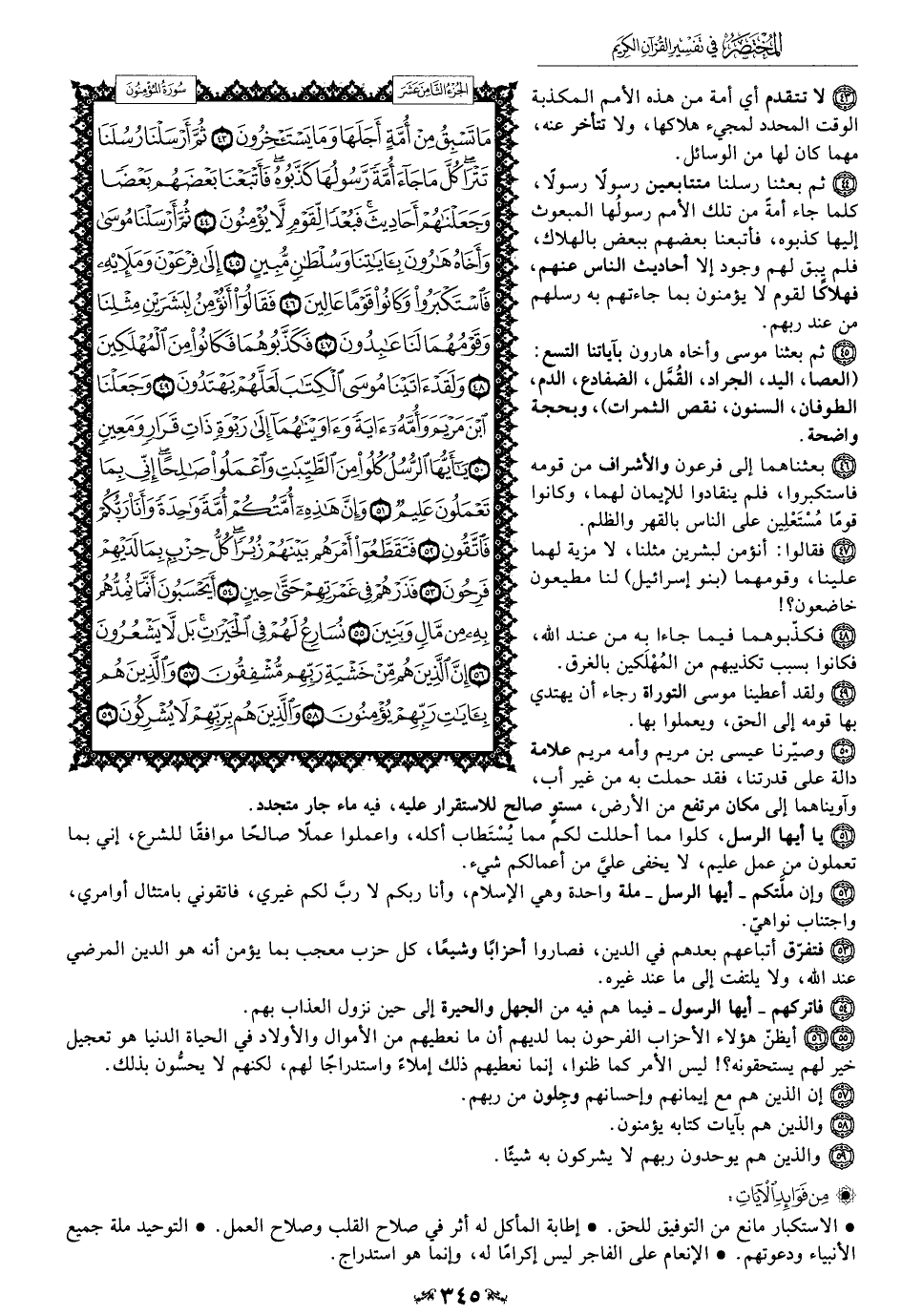 44 - ثم بعثنا رسلنا متتابعين رسولًا رسولًا، كلما جاء أمةً من تلك الأمم رسولُها المبعوث إليها كذبوه، فاتبعنا بعضهم ببعض بالهلاك، فلم يبق لهم وجود إلا أحاديث الناس عنهم، فهلاكًا لقوم لا يؤمنون بما جاءتهم به رسلهم من عند ربهم.