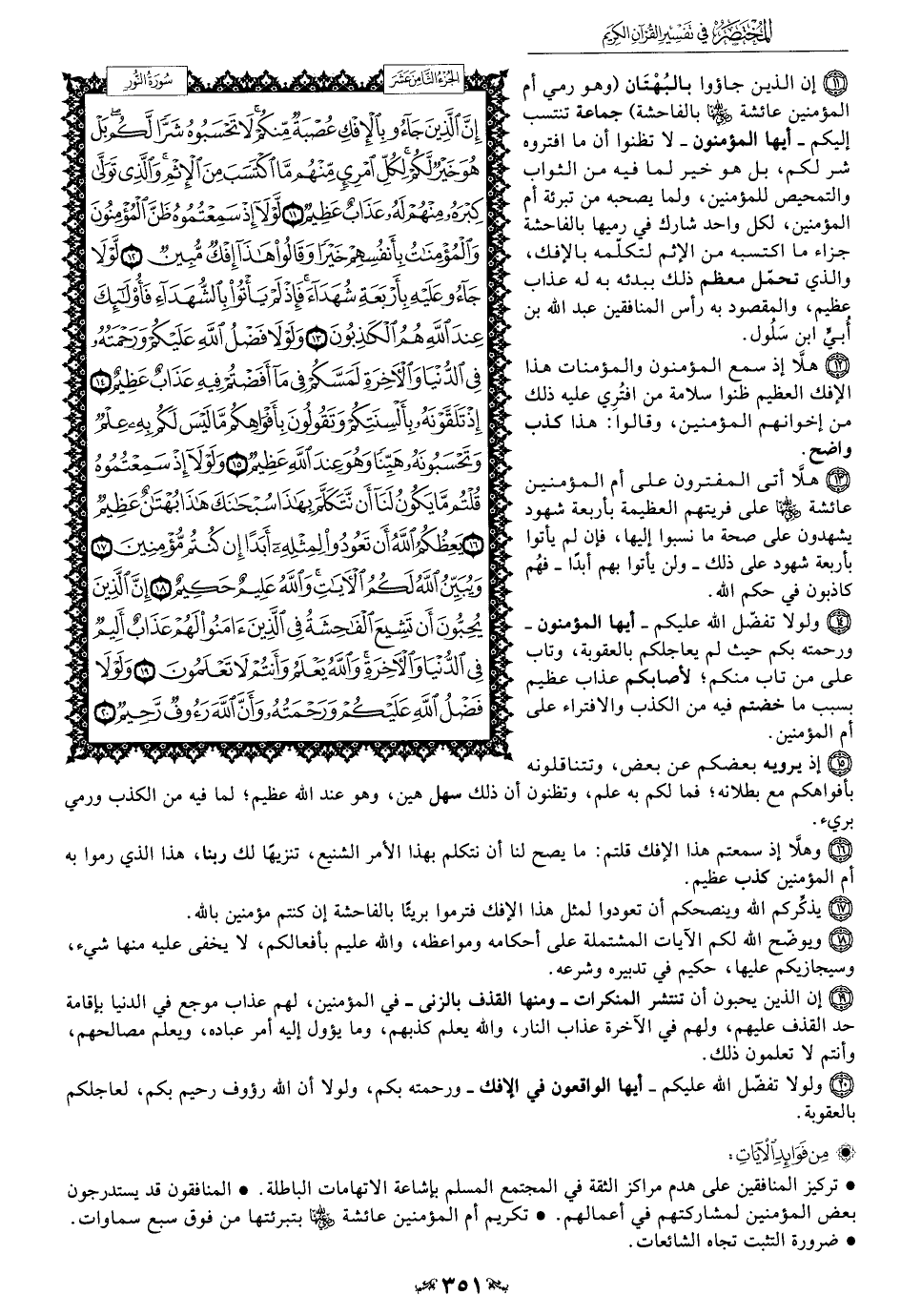 11 - إن الذين جاؤوا بالبُهْتَان (وهو رمي أم المؤمنين عائشة - رضي الله عنها - بالفاحشة) جماعة تنتسب إليكم -أيها المؤمنون- لا تظنوا أن ما افتروه شر لكم، بل هو خير لما فيه من الثواب والتمحيص للمؤمنين، ولما يصحبه من تبرئة أم المؤمنين، لكل واحد شارك في رميها بالفاحشة جزاء ما اكتسبه من الإثم لتكلّمه بالإفك، والذي تحمّل معظم ذلك ببدئه به له عذاب عظيم، والمقصود به رأس المنافقين عبد الله بن بن ابن سَلُول.