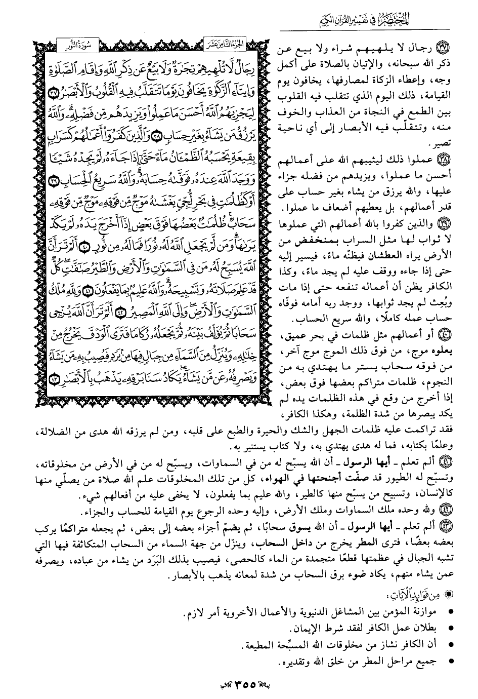 37 - رجال لا يلهيهم شراء ولا بيع عن ذكر الله سبحانه، والإتيان بالصلاة على أكمل وجه، وإعطاء الزكاة لمصارفها، يخافون يوم القيامة، ذلك اليوم الَّذي تتقلب فيه القلوب بين الطمع في النجاة من العذاب والخوف منه، وتتقلّب فيه الأبصار إلى أي ناحية تصير.
