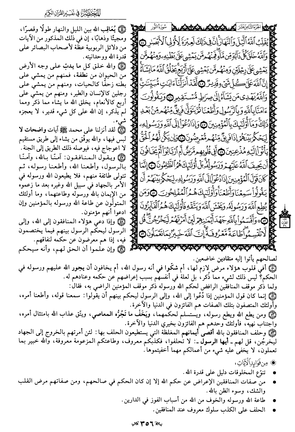 45 - والله خلق كل ما يدبّ على وجه الأرض من الحيوان من نطفة، فمنهم من يمشي على بطنه زحفًا كالحيات، ومنهم من يمشي على رجلين كالإنسان والطير، ومنهم من يمشي على أربع كالأنعام، يخلق الله ما يشاء مما ذكر ومما لم يذكر، إن الله على كل شيء قدير، لا يعجزه شيء.
