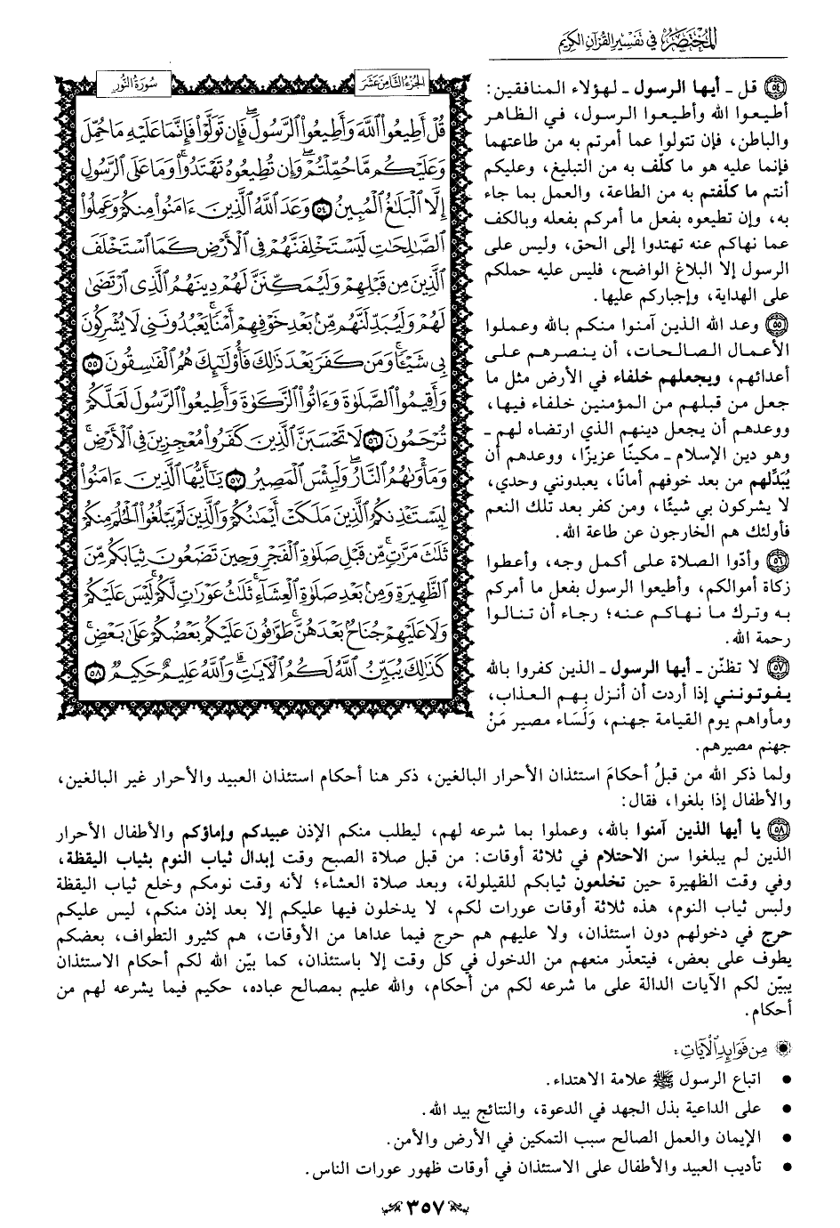58 - يا أيها الذين آمنوا بالله، وعملوا بما شرعه لهم، ليطلب منكم الإذن عبيدكم وإماؤكم والأطفال الأحرار الذين لم يبلغوا سن الاحتلام في ثلاثة أوقات: من قبل صلاة الصبح وقت إبدال ثياب النوم بثياب اليقظة، وفي وقت الظهيرة حين تخلعون ثيابكم للقيلولة، وبعد صلاة العشاء؛ لأنه وقت نومكم وخلع ثياب اليقظة ولبس ثياب النوم، هذه ثلاثة أوقات عورات لكم، لا يدخلون فيها عليكم إلا بعد إذن منكم، ليس عليكم حرج في دخولهم دون استئذان، ولا عليهم هم حرج فيما عداها من الأوقات، هم كثيرو التطواف، بعضكم يطوف على بعض، فيتعذّر منعهم من الدخول في كل وقت إلا باستئذان، كما بيّن الله لكم أحكام الاستئذان يبيّن لكم الآيات الدالة على ما شرعه لكم من أحكام، والله عليم بمصالح عباده، حكيم فيما يشرعه لهم من أحكام.