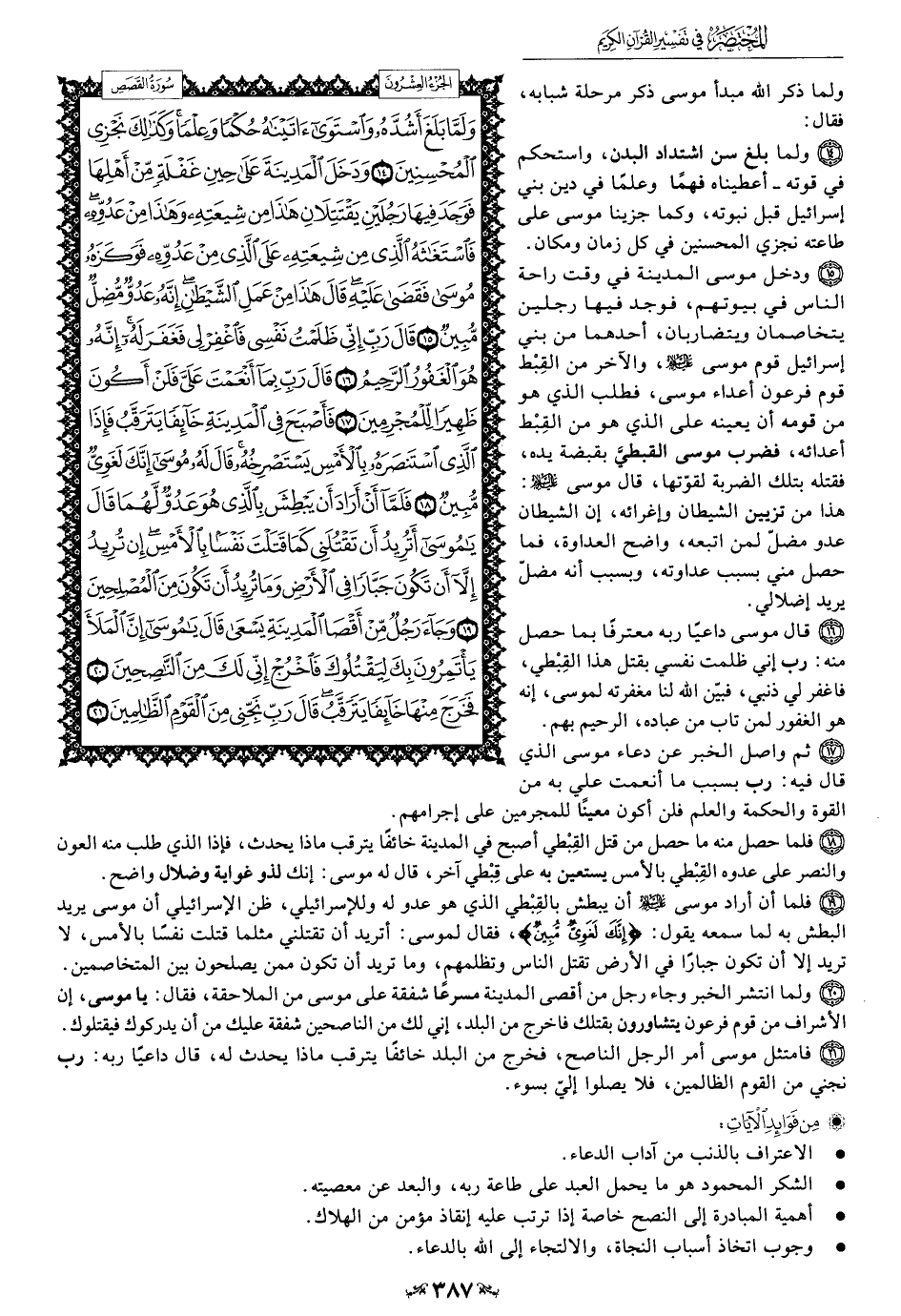 15 - ودخل موسى المدينة في وقت راحة الناس في بيوتهم، فوجد فيها رجلين يتخاصمان ويتضاربان، أحدهما من بني إسرائيل قوم موسى عليه السلام، والآخر من القِبْط قوم فرعون أعداء موسى، فطلب الَّذي هو من قومه أن يعينه على الَّذي هو من القِبْط أعدائه، فضرب موسى القبطي بقبضة يده، فقتله بتلك الضربة لقوّتها، قال موسى عليه السلام: هذا من تزيين الشيطان وإغرائه، إن الشيطان عدو مضلّ لمن اتبعه، واضح العداوة، فما حصل مني بسبب عداوته، وبسبب أنَّه مضلّ يريد إضلالي.