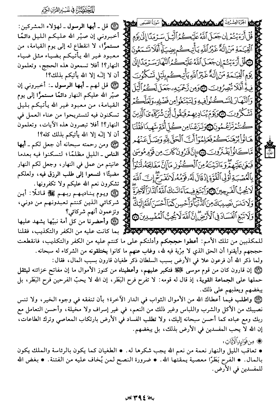 77 - واطلب فيما أعطاك الله من الأموال الثواب في الدار الآخرة، بأن تنفقه في وجوه الخير، ولا تنس نصيبك من الأكل والشرب واللباس وغير ذلك من النعم، في غير إسراف ولا مخيلة، وأحسن التعامل مع ربك ومع عباده كما أحسن سبحانه إليك، ولا تطلب الفساد في الأرض بارتكاب المعاصي وترك الطاعات، إن الله لا يحب المفسدين في الأرض بذلك، بل يبغضهم.