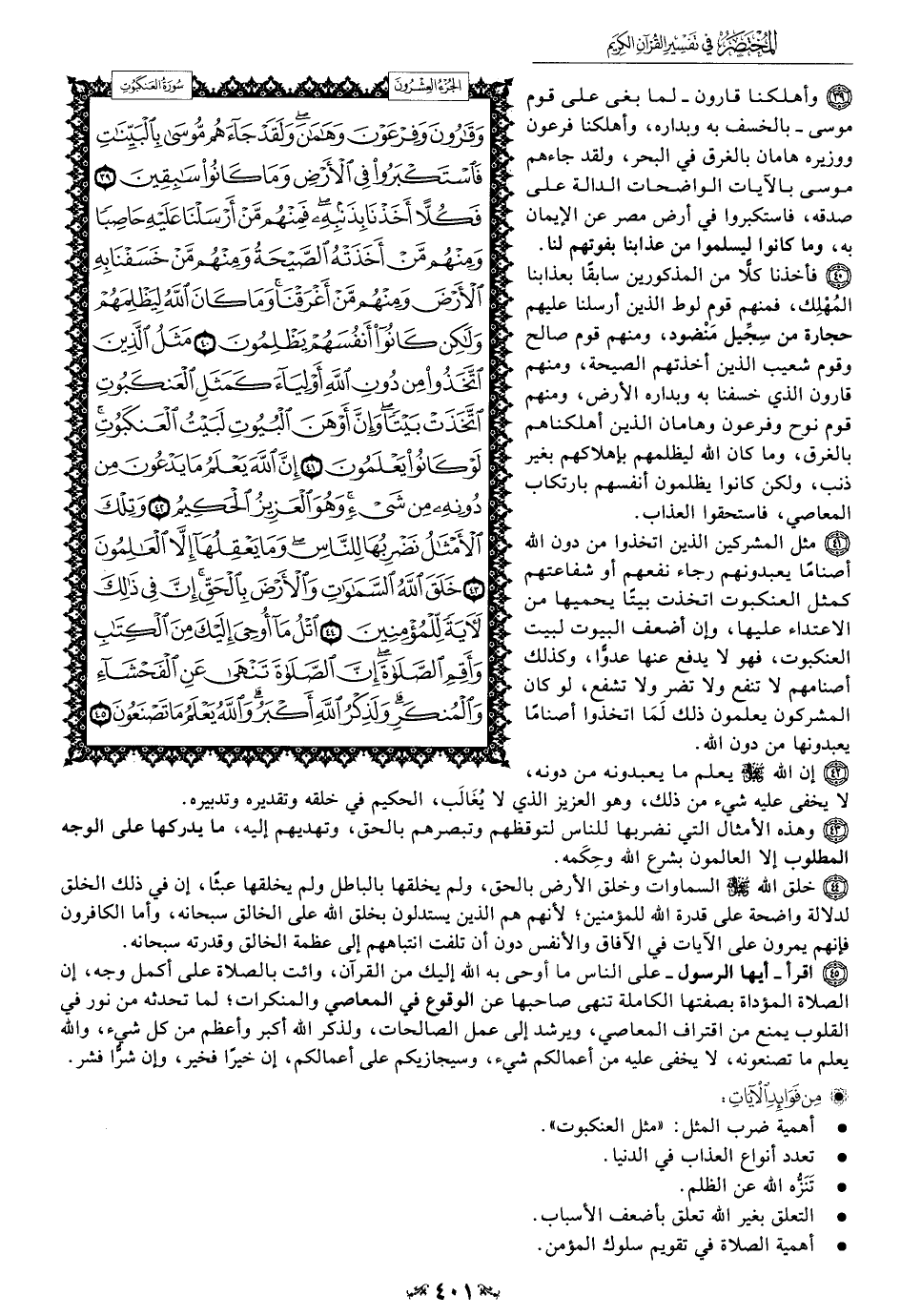 45 - اقرأ -أيها الرسول- على الناس ما أوحى به الله إليك من القرآن، وائت بالصلاة على أكمل وجه، إن الصلاة المؤداة بصفتها الكاملة تنهى صاحبها عن الوقوع في المعاصي والمنكرات؛ لما تحدثه من نور في القلوب يمنع من اقتراف المعاصي، ويرشد إلى عمل الصالحات، ولذكر الله أكبر وأعظم من كل شيء، والله يعلم ما تصنعونه، لا يخفى عليه من أعمالكم شيء، وسيجازيكم على أعمالكم، إن خيرًا فخير، وإن شرًّا فشر.