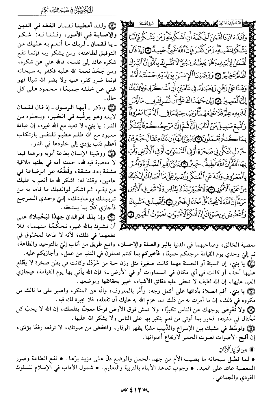 13 - واذكر -أيها الرسول- إذ قال لقمان لابنه وهو يرغِّبه في الخير، ويحذره من الشر: يا بني، لا تعبد مع الله غيره، إن عبادة معبود مع الله ظلم عظيم للنفس بارتكاب أعظم ذنب يؤدي إلى خلودها في النار.