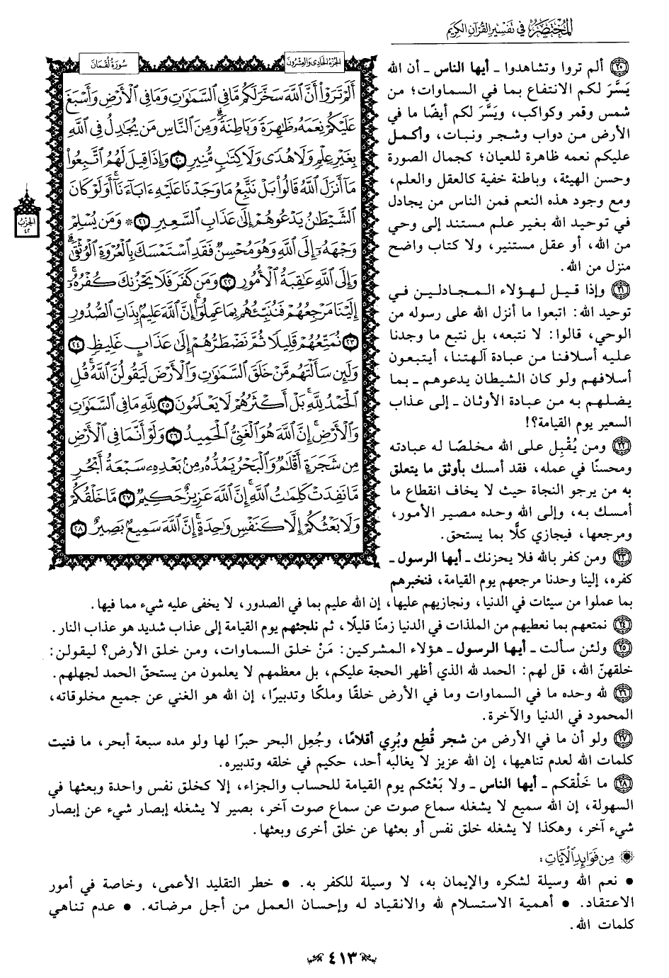 20 - ألم تروا وتشاهدوا -أيها الناس- أن الله يَسَّرَ لكم الانتفاع بما في السماوات؛ من شمس وقمر وكواكب، ويَسَّرَ لكم أيضًا ما في الأرض من دواب وشجر ونبات، وأكمل عليكم نعمه ظاهرة للعيان؛ كجمال الصورة وحسن الهيئة، وباطنة خفية كالعقل والعلم، في توحيد الله لغير علم مستند إلى وحى من الله، أو عقل مستنير، ولا كتاب واضح منزل من الله.