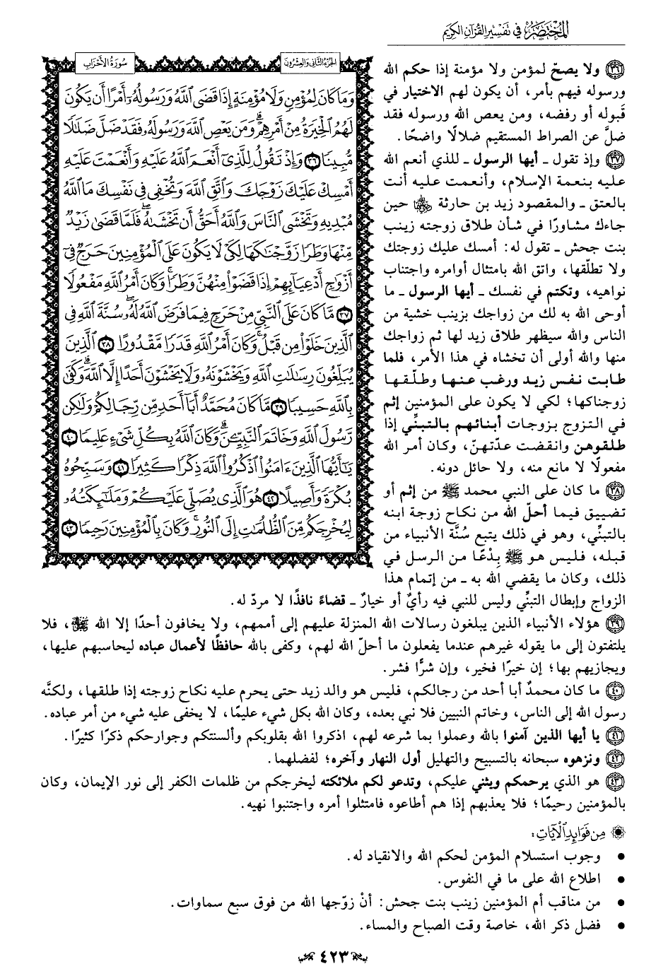 38 - ما كان على النبي محمد - صلى الله عليه وسلم - من إثم أو تضييق فيما أحلّ الله من نكاح زوجة ابنه بالتبنِّي، وهو في ذلك يتبع سُنَّة الأنبياء من قبله، فليس هو - صلى الله عليه وسلم - بدْعًا من الرسل في ذلك، وكان ما يقضي الله به -من إتمام هذا الزواج وإبطال التبنِّي وليس للنبي فيه رأي أو خيارٌ- قضاءً نافذًا لا مردّ له.