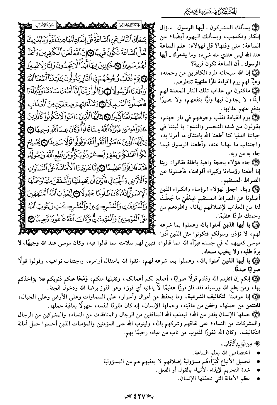 63 - يسألك المشركون -أيها الرسول- سؤال إنكار وتكذيب، ويسألك اليهود أيضًا؛ عن الساعة: متى وقتها؟ قل لهؤلاء: علم الساعة عند الله ليس عندي منه شيء، وما يشعرك -أيها الرسول- أن الساعة تكون قريبة؟