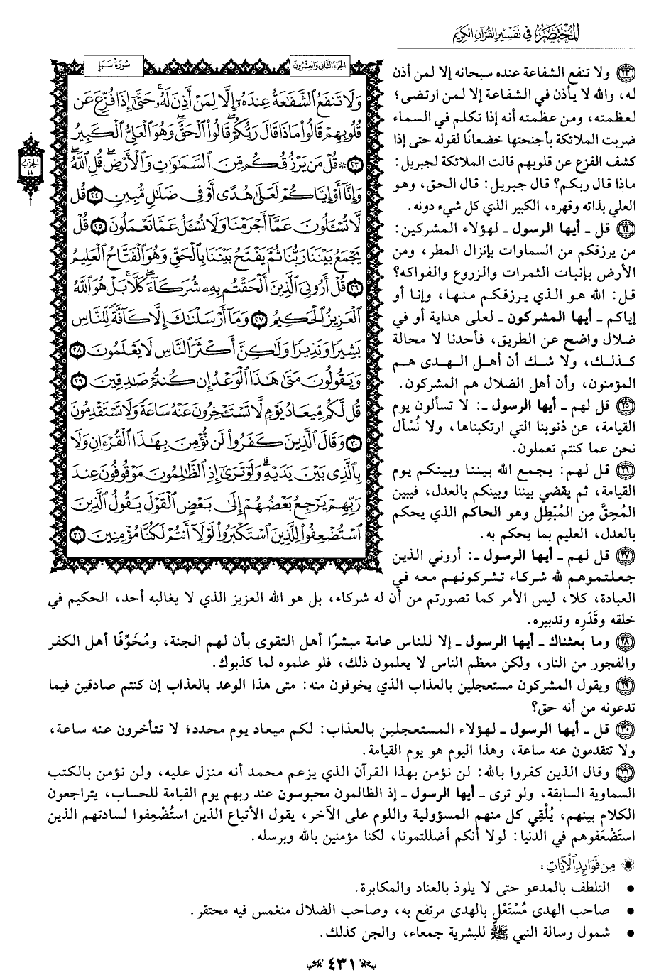 30 - قل -أيها الرسول- لهؤلاء المستعجلين بالعذاب: لكم ميعاد يوم محدد؛ لا تتأخرون عنه ساعة، ولا تتقدمون عنه ساعة، وهذا اليوم هو يوم القيامة.