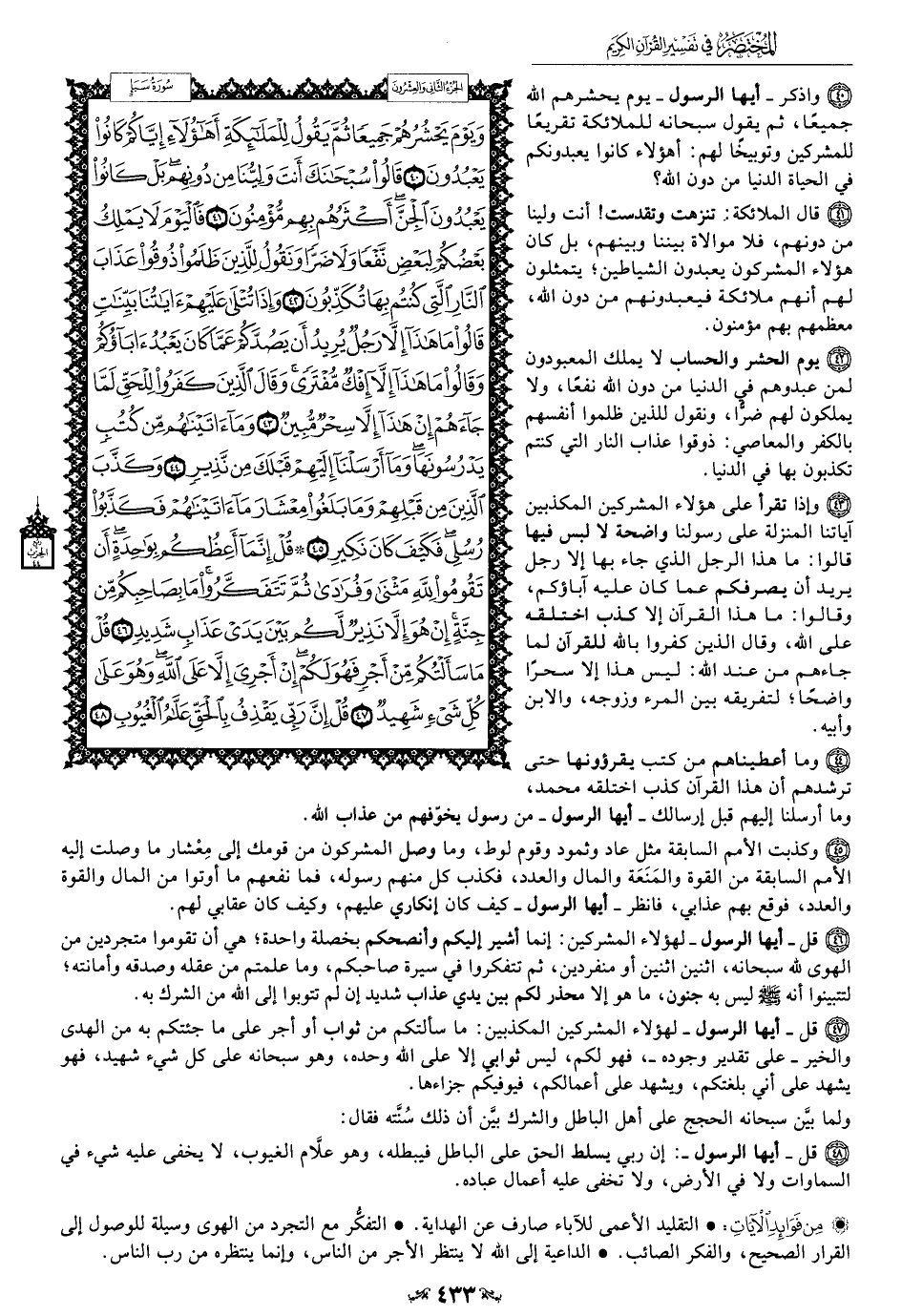 40 - واذكر -أيها الرسول- يوم يحشرهم الله جميعًا، ثم يقول سبحانه للملائكة تقريعًا للمشركين وتوبيخًا لهم: أهؤلاء كانوا يعبدونكم في الحياة الدنيا من دون الله؟